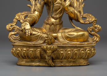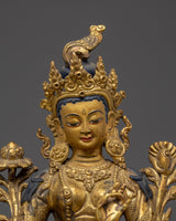 This Green Tara Buddha Artwork represents protection, healing, and spiritual enlightenment. This handcrafted statue, which measures 8.5" (Height) x 6.7" (Base) and weighs 1.49 kg, is made of copper and has a durable and spiritual appeal. Crafted by expert artisans, this item symbolizes the rich traditions of Himalayan Buddhism, making it an important addition to altars, meditation places, or holy collections.