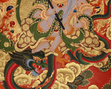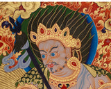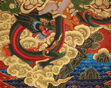 White Dzambhala Thangka is a powerful Tibetan symbol of wealth and prosperity. The deity is portrayed in a dynamic, seated posture atop a dragon. The dragon symbolizes protection, movement, and mastery over obstacles while holding a trident-tipped staff, symbolizing dominion over opposing forces. Surrounding Dzambhala are swirling golden clouds and luminous floral motifs. The wrathful guardian face of Kirtimukha emerges from the clouds, protecting the spiritual sanctity of the deity's domain.