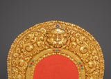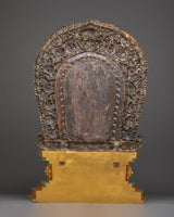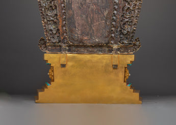 Every inch of this magnificent throne is adorned with intricate carvings and vibrant turquoise and coral stones, capturing the essence of traditional Tibetan artistry. The turquoise symbolizes healing, tranquility, and protection, while coral embodies vitality and compassion—together, they balance spiritual and earthly energies. Each gemstone is carefully inlaid into the gold-plated copper surface, surrounded by ornate motifs of lotus petals, scrolls, and auspicious symbols that reflect harmony, enlightenment, and devotion. The craftsmanship showcases the profound skill of Himalayan artisans, who have preserved this sacred art for generations.