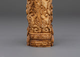 The Mahakala statue depicts the deity in a powerful and dynamic pose, characterized by distinctive features such as flaming hair, a skull crown, and a vajra in his hand. These symbols represent Mahakala's ability to transform negative energy into spiritual power. The buffalo bone material was chosen for its strong connection to the earth, which represents grounding, and protection. The skull symbols signify the eradication of ignorance, while Mahakala's flaming appearance underscores his role as a powerful defender. The buffalo bone's hand-carved textures and meticulous workmanship create a beautiful piece with deep spiritual significance.