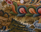 The hand-painted thangka painting vividly represents the divine union between the powerful deity Heruka Vajrasattva and Consort. Vajrasattva, the embodiment of purification, together with his consort, symbolizes the harmonious balance of wisdom and compassion. He is depicted seated on a lotus throne, which symbolizes the purification of all negative energies. His posture and expression embody the powerful transformation he offers, clearing the path for spiritual growth. His consort, embracing him in a sacred union, symbolizes the integration of masculine and feminine energies, an essential teaching in Tibetan Buddhism that highlights the balance of wisdom and compassion.