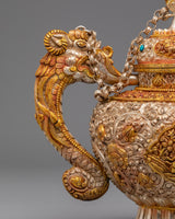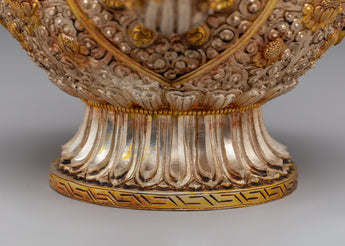 This Handcrafted Buddhist Ritual Teapot is a striking ceremonial vessel used in Tibetan Buddhist offerings, visualization practices, and altar arrangements. Expertly shaped from a copper body and enriched with gold and silver plating, the teapot reflects the elegance and symbolism rooted in Himalayan spiritual arts. The blend of warm metallic tones and vibrant inlays gives the piece a sacred presence, ideal for practitioners and collectors.