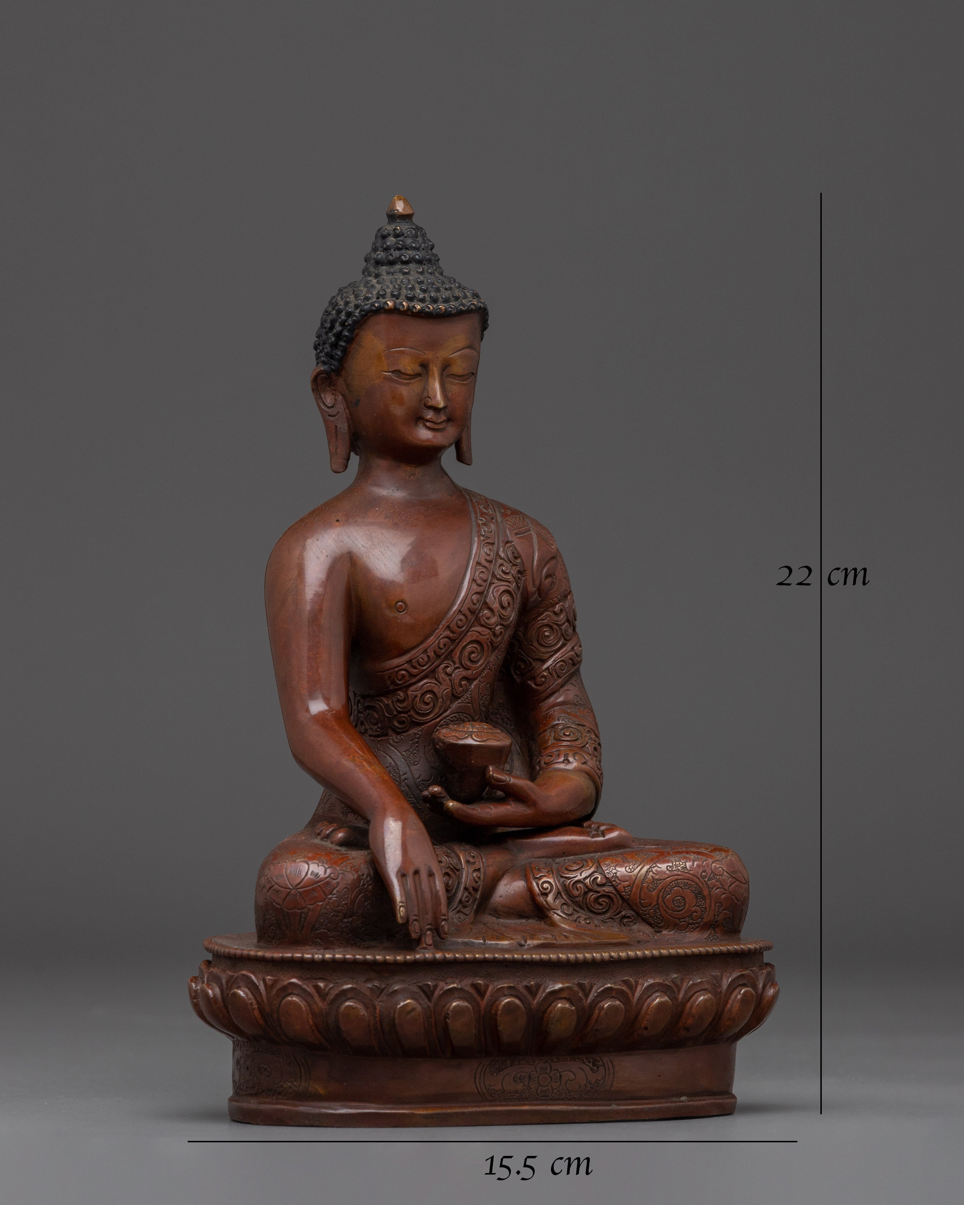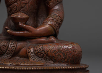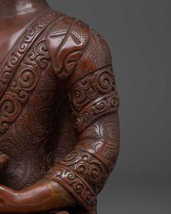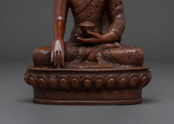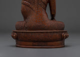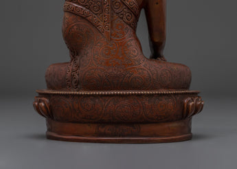 This stunning handcrafted oxidized copper Shakyamuni Buddha Statue is 8.7 inches tall and has an Oxidized Finish that represents the Buddha's profound knowledge and serene presence. The statue's excellent features, from the elaborate patterns of the robes to the tranquil expression on the Buddha's face, add a feeling of peace and enlightenment to any setting. This statue is an excellent addition to your meditation altar, home décor, or spiritual collection.