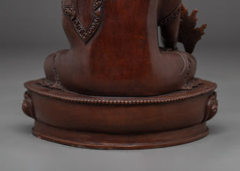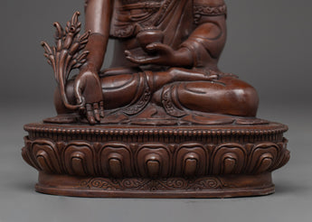 The Handcrafted Sculpture of Medicine Buddha stands 9.3 inches (23.5cm) in height with a base width of 6.5 inches (16.5cm), making it a graceful piece for any space. Crafted from an oxidized copper body. Symbolizing healing, compassion, and tranquility, this statue embodies the essence of the Medicine Buddha.