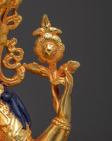 This handcrafted statue of Chenrezig, the Bodhisattva of Compassion, will add beauty to your holy place. It is made of copper and electro-gold-plated, with a face of pure gold powder to represent heavenly clarity and spiritual light. This precisely proportioned figure, at 16.5cm tall and 13cm wide and weighing 0.59kg, reflects the spirit of compassion in graceful form.
