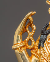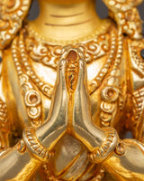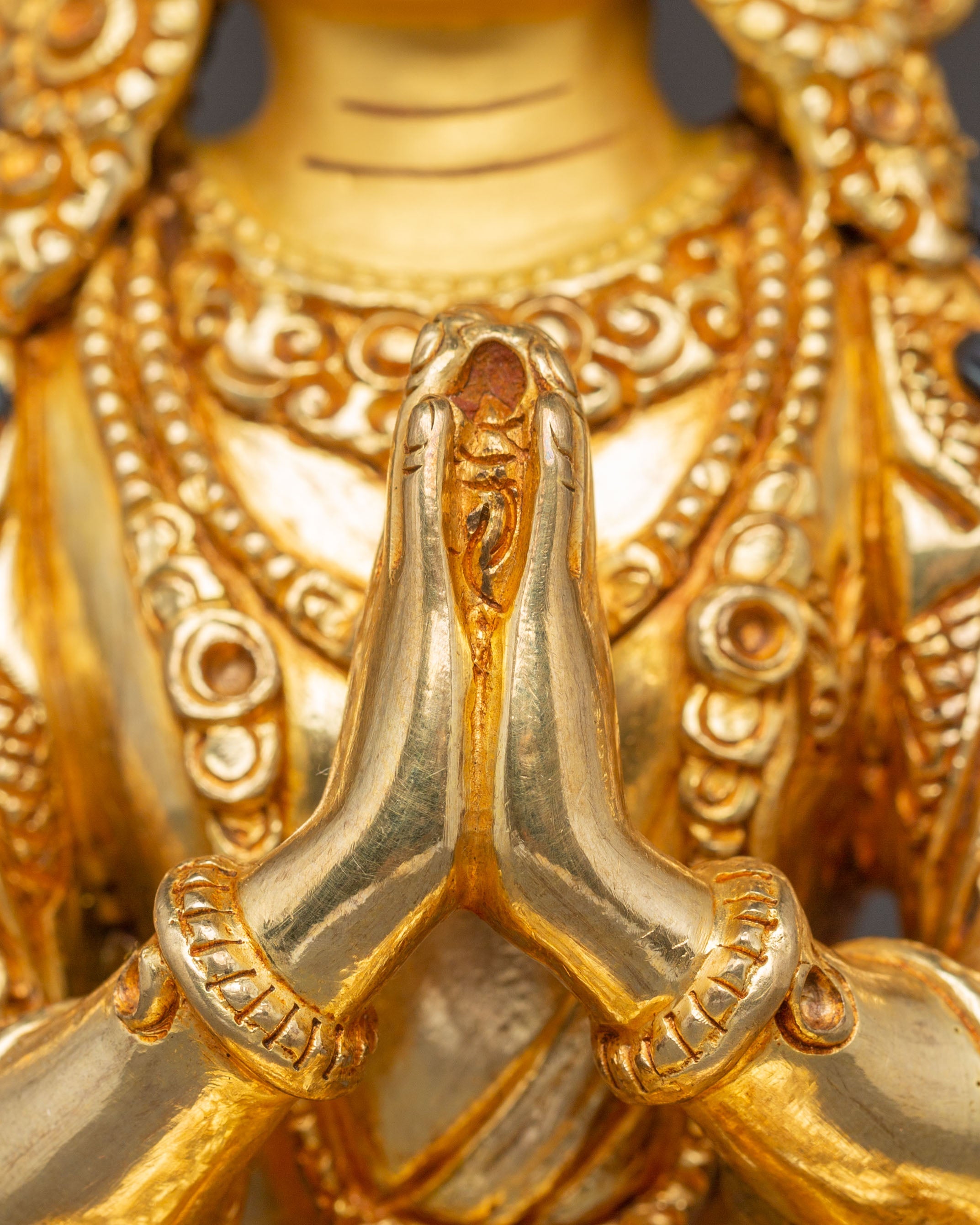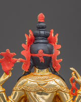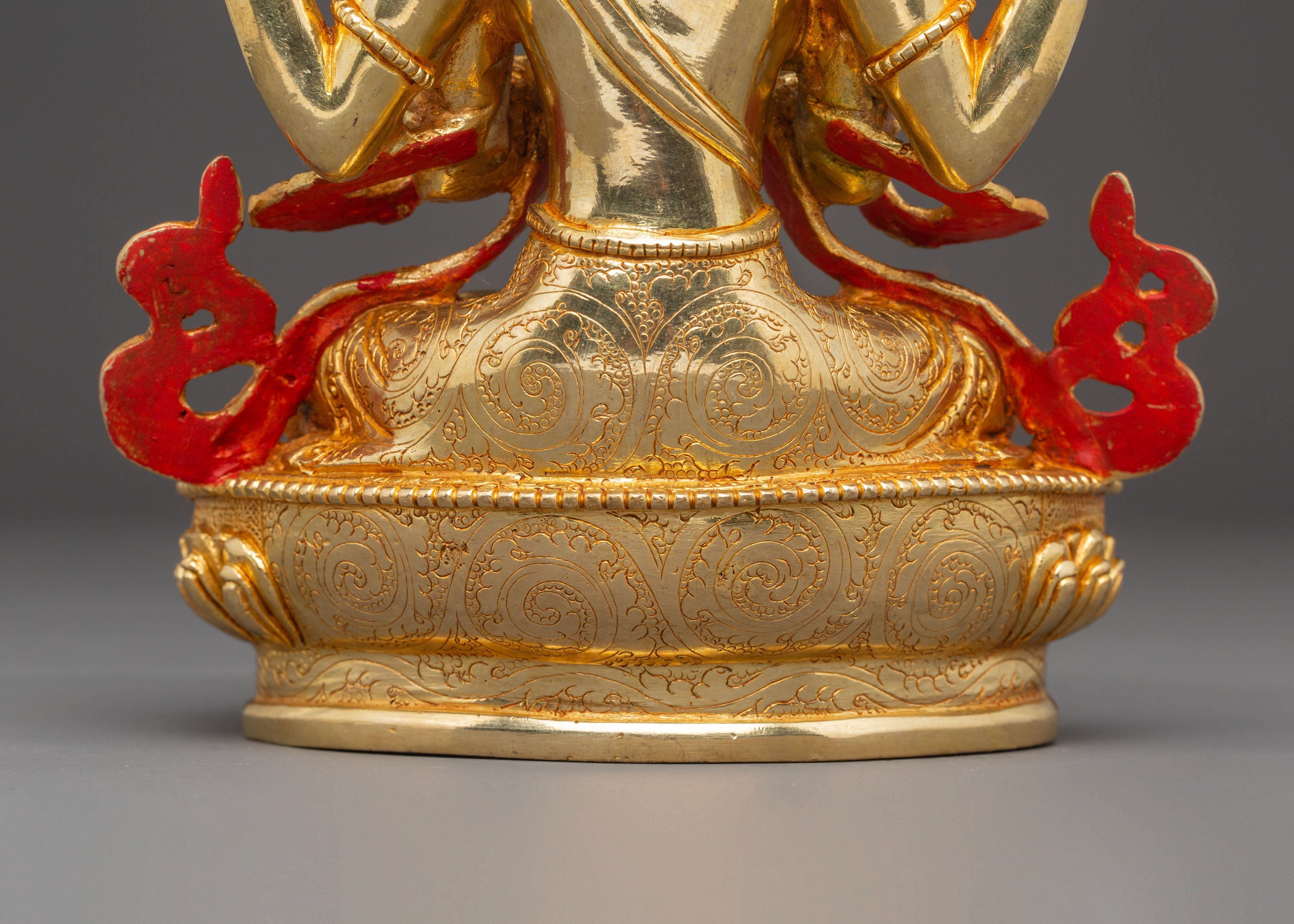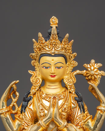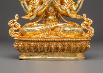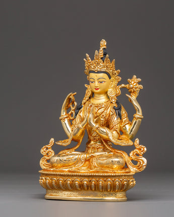 The handcrafted statue of Four-Armed Chenrezig, measuring 6.3”/16cm in height and 4.7”/12cm at the base, is made from copper and adorned with 24K gold gilding and gold and acrylic paintings. The statue reflects the essence of Chenrezig, the Bodhisattva of Compassion, with intricate craftsmanship that highlights his serene expression and symbolic posture. Weighing 1.46 kg, it serves as a powerful symbol of compassion and is ideal for personal altars, meditation spaces, or spiritual collections.