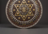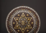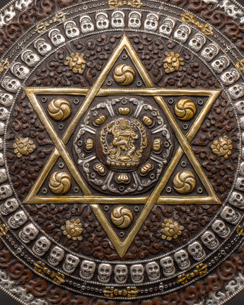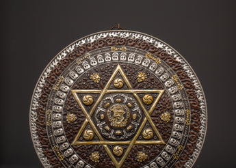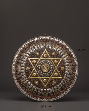 Enhance your spiritual surroundings with our Handcrafted Tibetan Mandala Wall Hanging, a Sacred Geometric Symbol Decor. This gorgeous wall hanging is made of oxidized copper with a silver-plated finish and contains an elaborate sacred geometric pattern representing protection, spiritual harmony, and balance. The primary design is a complex six-pointed star mandala surrounded by fortunate symbols and ornate details. This incredibly appealing wall hanging is 31cm in height and 30.5cm in width and weighs 0.72kg. It is ideal as a focal point in meditation rooms, yoga studios, and spiritual retreats, attracting positive energy and improving mindfulness practices.