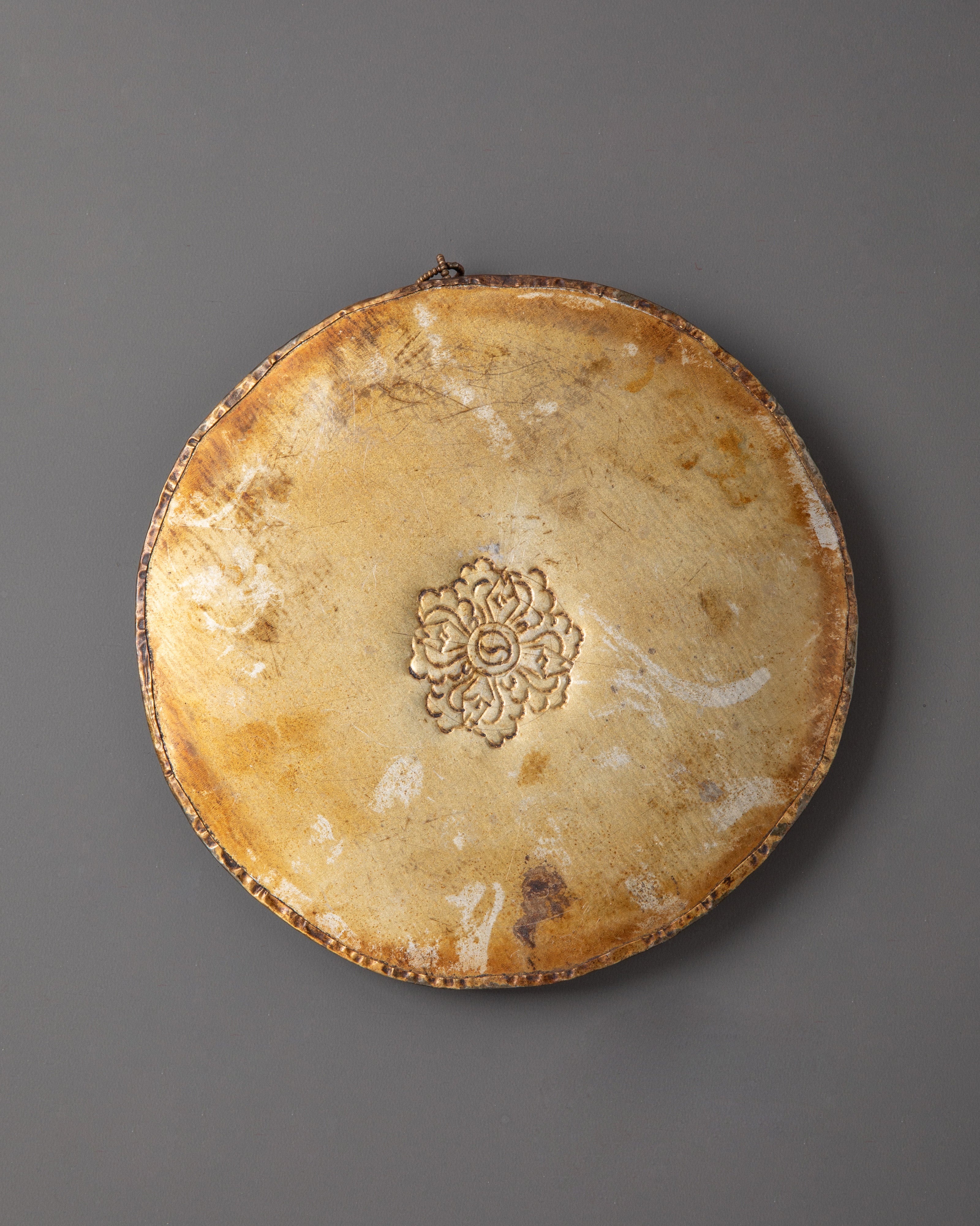 This brass wall hanging is meticulously crafted, with traditional designs and engraved workmanship that depict the rich creativity of Tibetan Buddhist culture. The turquoise and coral inlays provide a mystic touch by representing healing energy and spiritual life. The core mandala represents the infinite cycle of life, acting as a spiritual reminder of harmony and balance. Its warm golden tones and elaborate textures make it suitable for meditation areas, shrines, or as an attractive wall accent in the house.