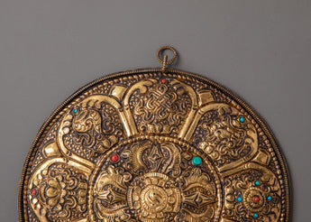 This Handmade Eight Auspicious Symbol Wall Hanging is a stunning example of Tibetan artistry that represents divine harmony and spiritual wealth. This brass wall sculpture measures 20.5cm in height and 19.5cm in width, weighs 1.18kg, and is delicately decorated with imitation coral and turquoise stones. The mandala design is wonderfully embossed with the Eight Auspicious Symbols (Ashtamangala): the Dharma Wheel, Lotus, Parasol, Conch Shell, Endless Knot, Victory Banner, Vase, and Golden Fish, which signify blessings of happiness, protection, and enlightenment.