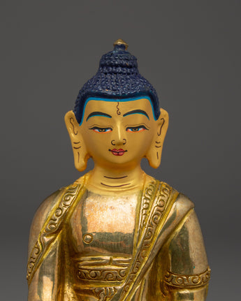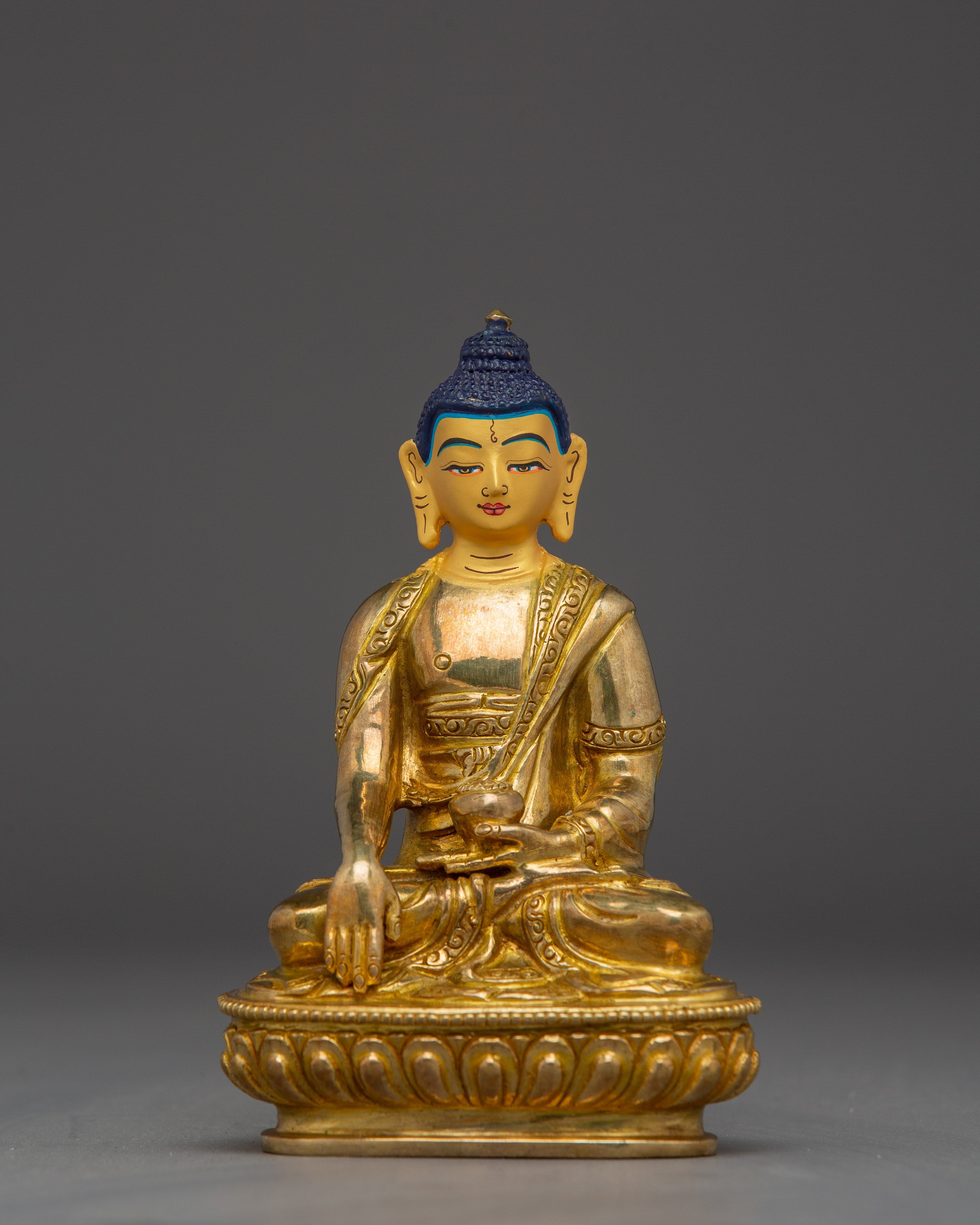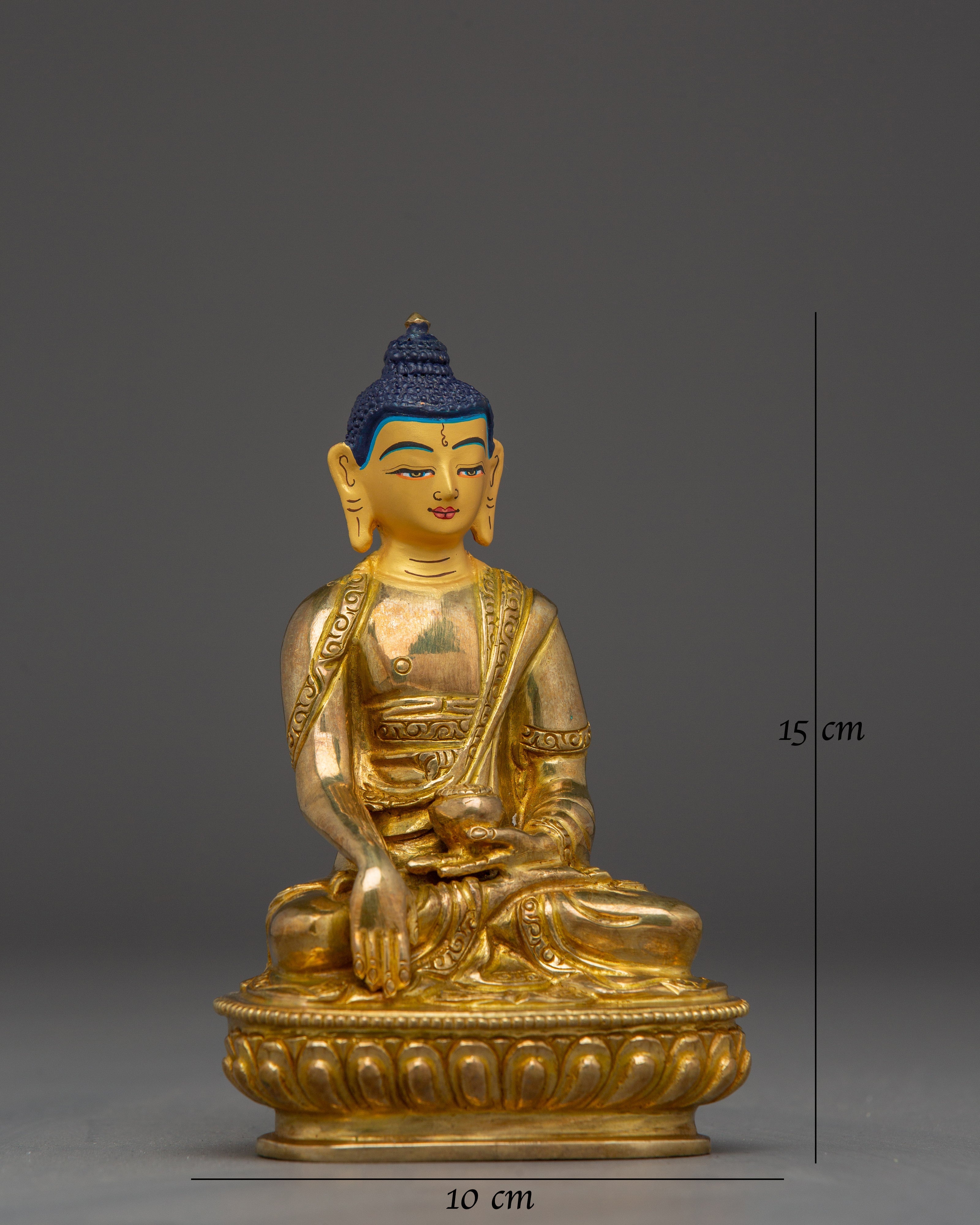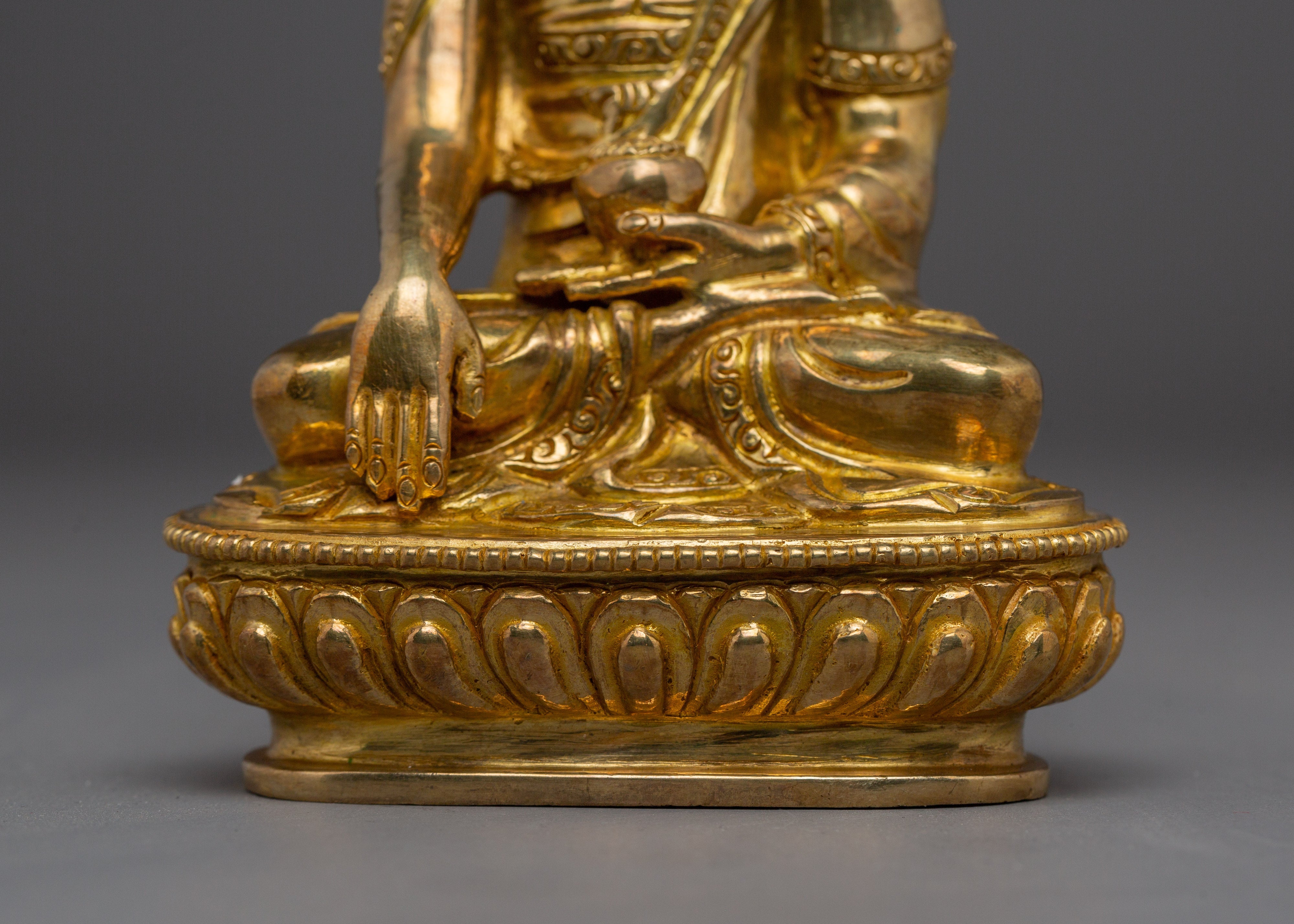 Shakyamuni Buddha is depicted in a calm, meditative state with half-closed eyes, embodying profound inner peace and an awakened presence. His right hand is in the bhūmisparśa mudrā (earth-touching gesture), signifying the moment he called the Earth to witness his enlightenment. His left hand holds an alms bowl, symbolizing renunciation and the simplicity of the monastic path, emphasizing his transcendent wisdom. He sits gracefully in the vajra posture on a moon disc lotus base, conveying stability, spiritual purity, and unwavering focus. This refined iconography honors the profound presence of the historical Buddha—serene, dignified, and deeply symbolic.