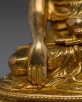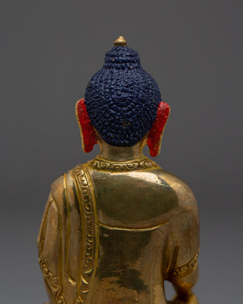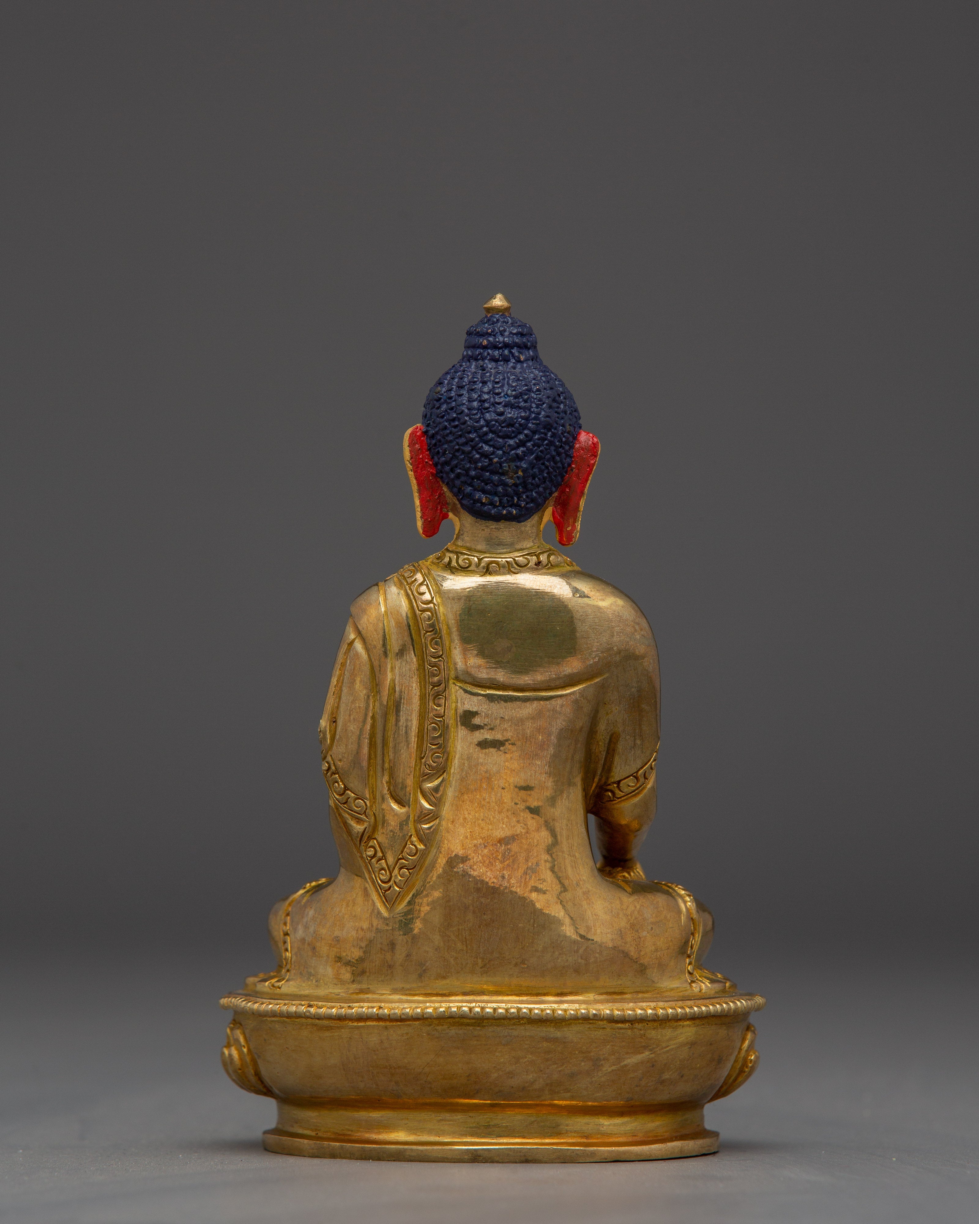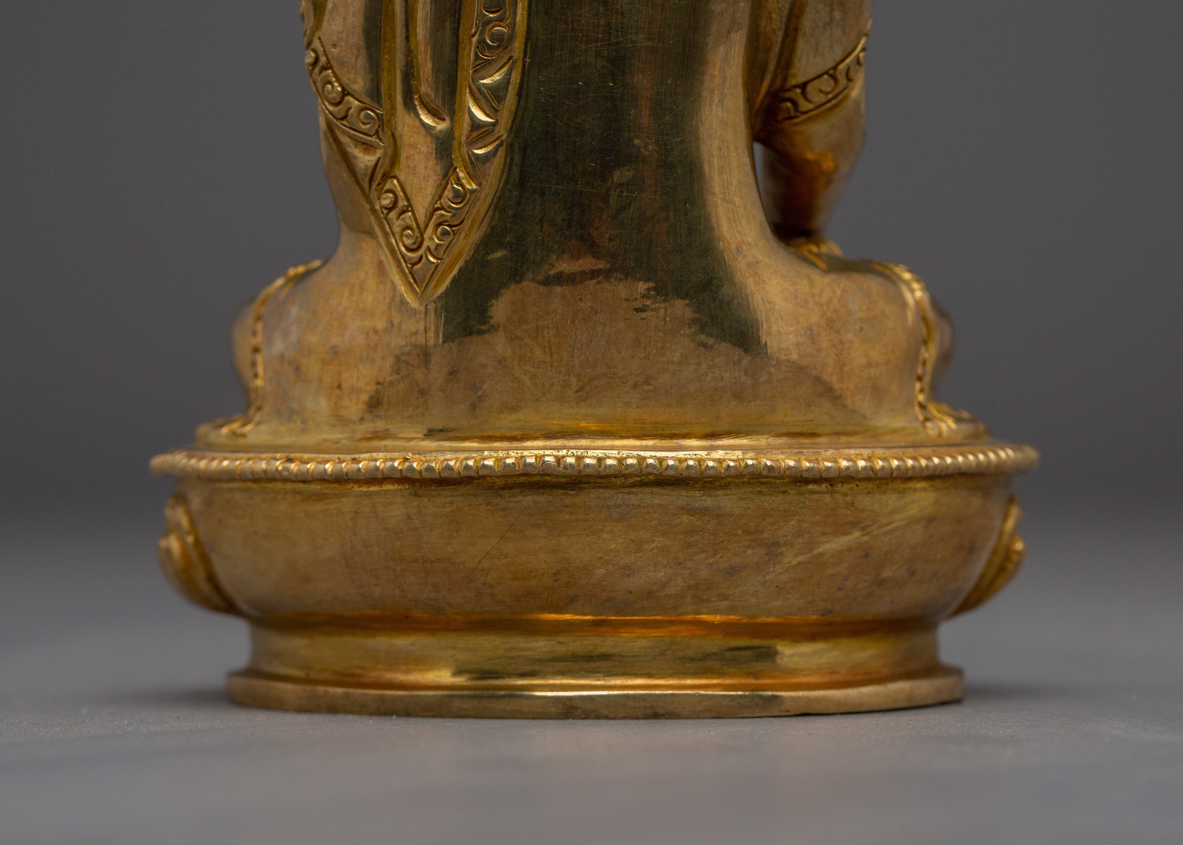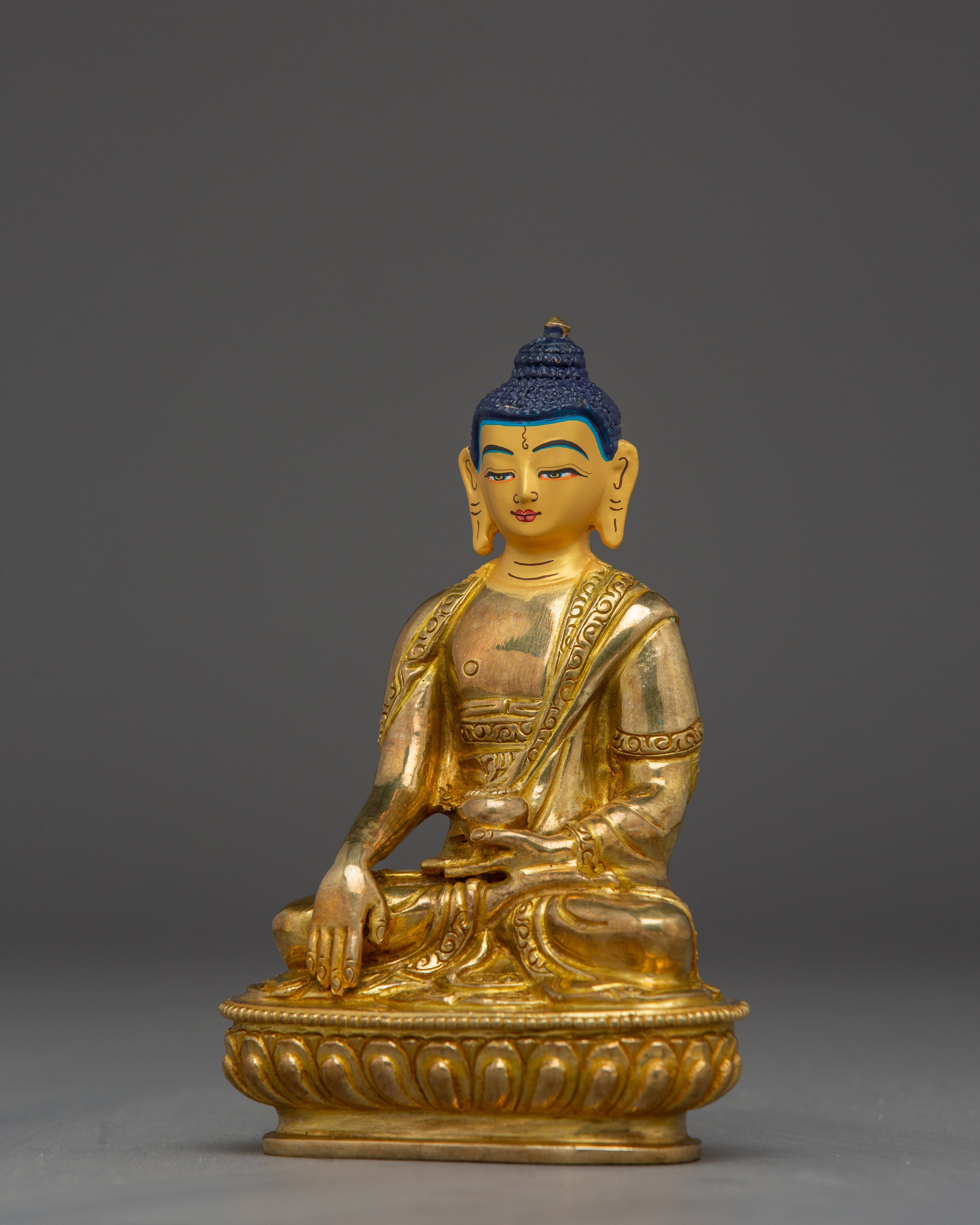 Shakyamuni Buddha is depicted in a calm, meditative state with half-closed eyes, embodying profound inner peace and an awakened presence. His right hand is in the bhūmisparśa mudrā (earth-touching gesture), signifying the moment he called the Earth to witness his enlightenment. His left hand holds an alms bowl, symbolizing renunciation and the simplicity of the monastic path, emphasizing his transcendent wisdom. He sits gracefully in the vajra posture on a moon disc lotus base, conveying stability, spiritual purity, and unwavering focus. This refined iconography honors the profound presence of the historical Buddha—serene, dignified, and deeply symbolic.