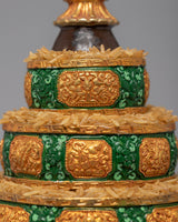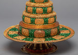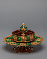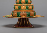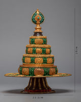 The word Mandala can be broken into two sections: maṇḍa implies the 'quintessence' or 'center and surroundings,' and la signifies 'grabbing hold of.’ It shows the natural balance of the outer world and the inner mind and can also be part of the daily preliminaries of meditation. It represents a combination of Buddha’s enlightened mind and body and is considered a great power. Mandala offering is a powerful custom practice in Tibetan Buddhism.