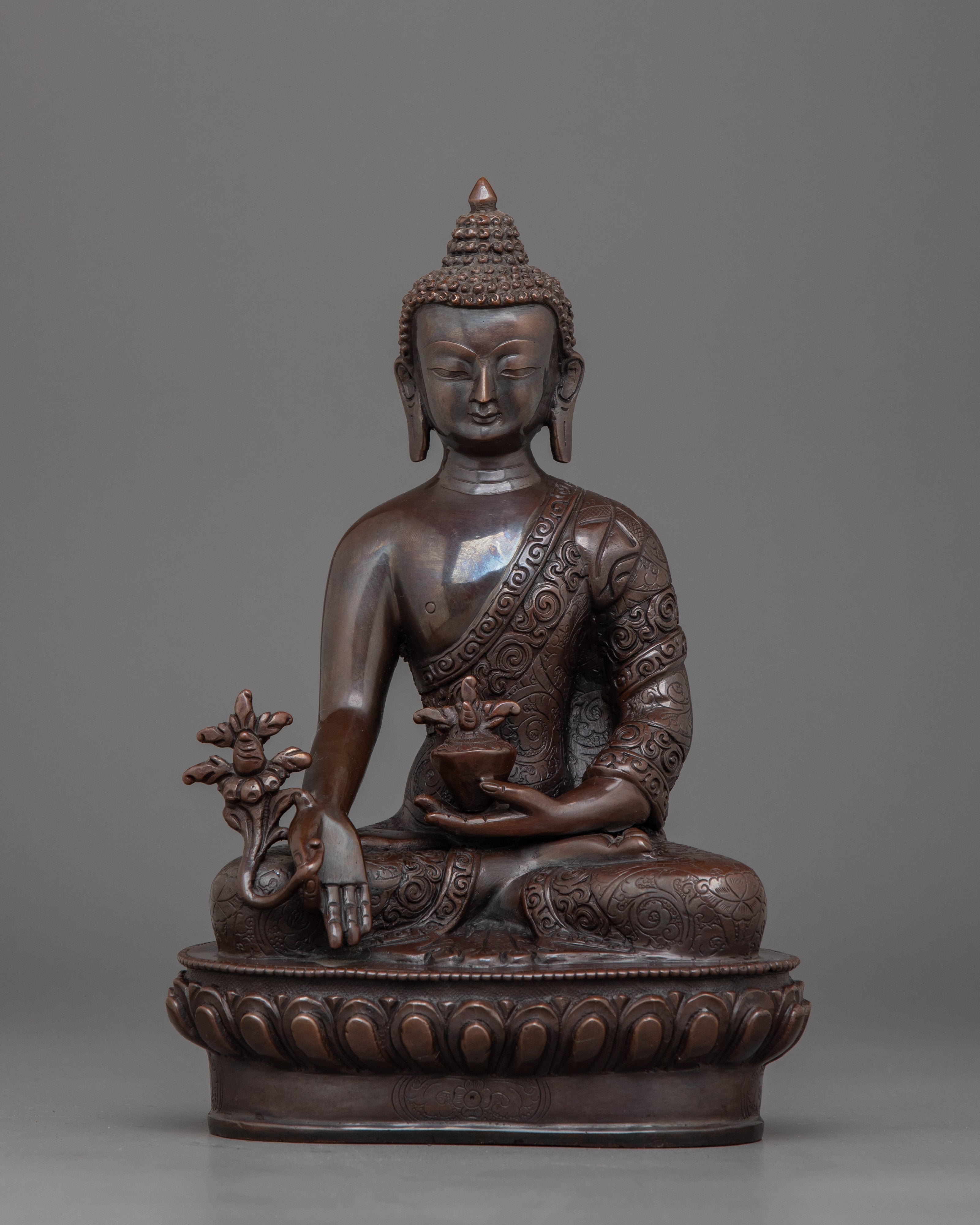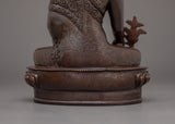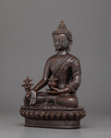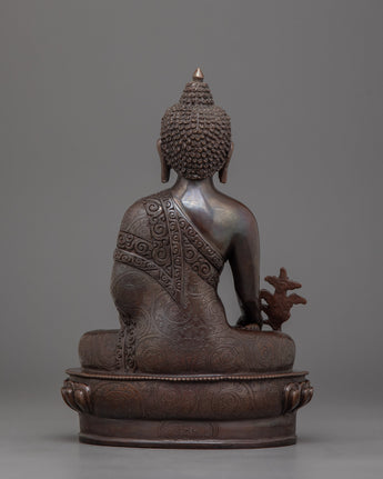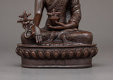 The Handmade Medicine Buddha Deity Figurine, stands 8.7 inches (22cm) in height with a base width of 5.9 inches (15cm), making it a graceful piece for any space. Crafted from an oxidized copper body, it highlights its spiritual significance and artistic craftsmanship. Symbolizing healing, compassion, and tranquility, this statue embodies the essence of the Medicine Buddha.