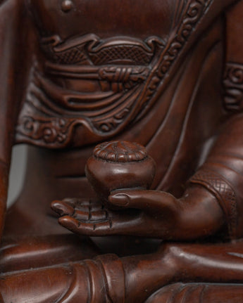 Shakyamuni Buddha is depicted sitting in the lotus pose (padmasana), indicating his steady concentration and mastery over the distractions of the material world. His right hand stretched toward the earth in bhumisparsha mudra, represents his moment of enlightenment, inviting the earth to witness his waking. The left hand, lying gently in his lap in dhyana mudra holding an alms bowl depicts the profound state of meditation and mindfulness that leads to insight and clarity.