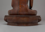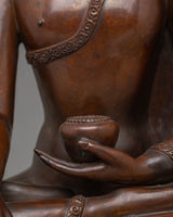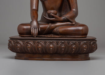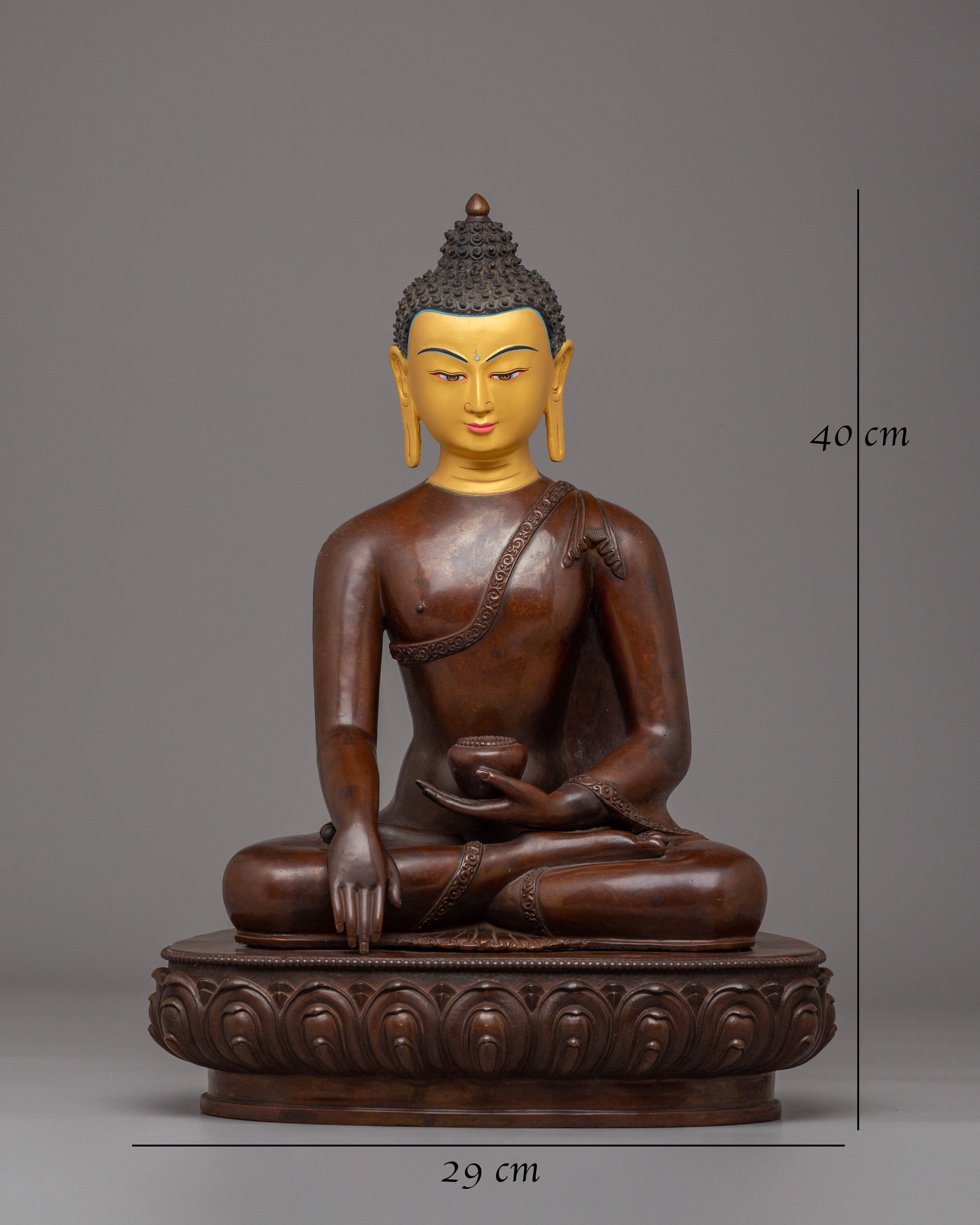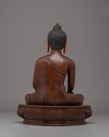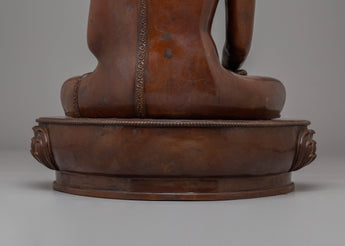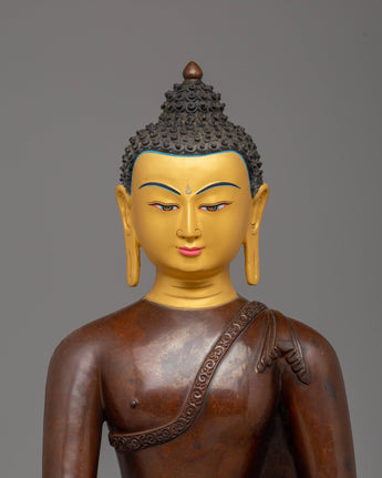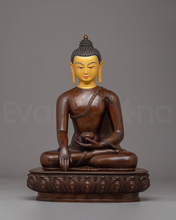 The Handmade Tibetan Shakyamuni Buddha is depicted in a traditional lotus position, symbolizing spiritual enlightenment, inner peace, and the path to liberation. His hands are positioned in a meditation mudra, signifying the peaceful state of being. The oxidized copper body gives the Buddha a rich, earthy tone, while the gold plating enhances the figure's divine and sacred elements. The finely applied acrylic colors bring out the details in the face, robes, and lotus throne, giving the sculpture life and vibrancy. The beautiful lotus base represents purity, with petals extending outward to symbolize the blossoming of wisdom and compassion.