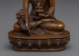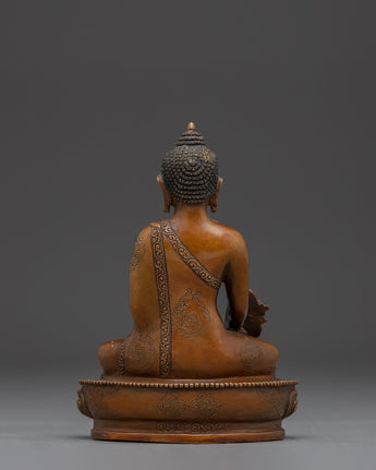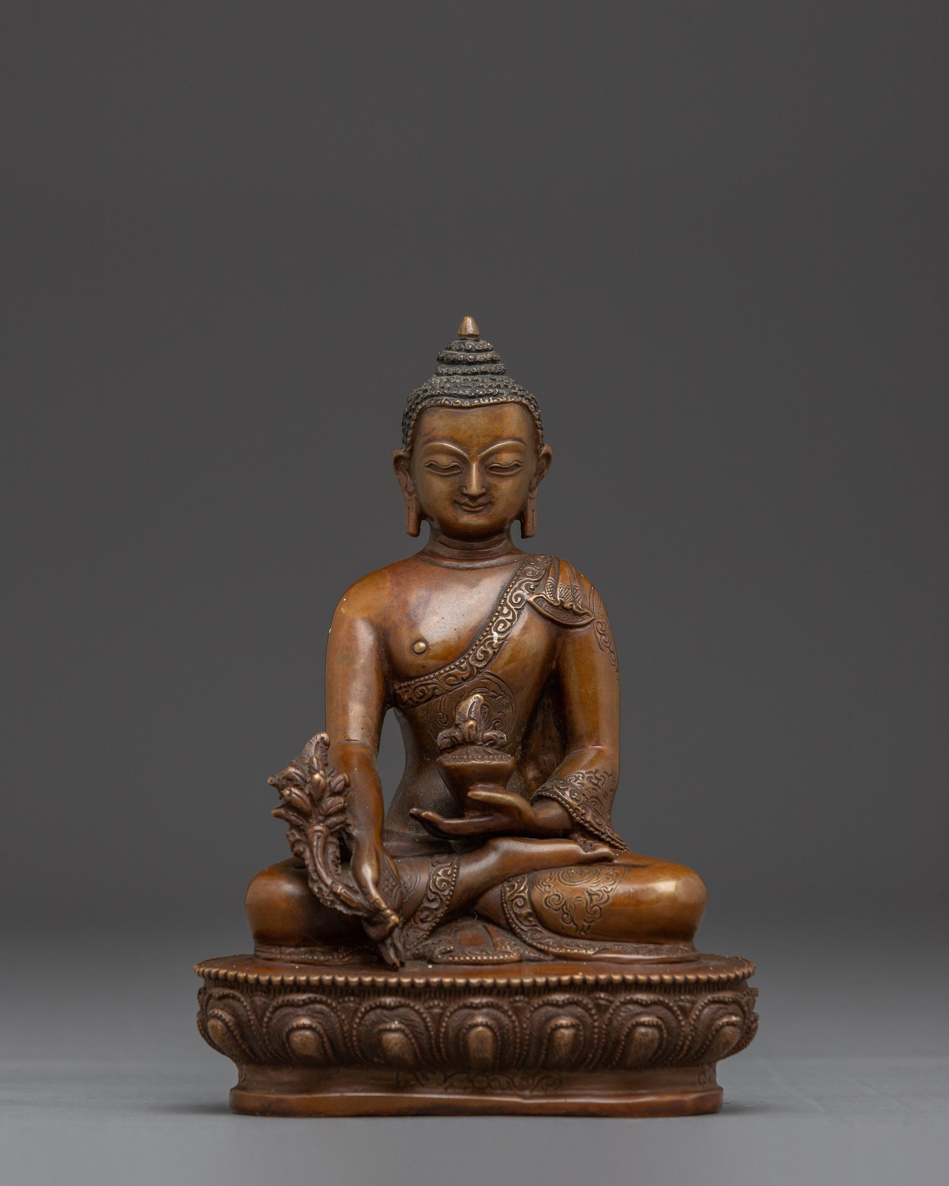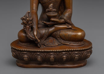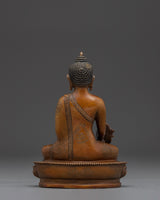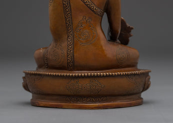 Healing Bhaisajyaguru Art measures 5.5 inches (14 cm) in height and 3.9 inches (10 cm) at the base, with a weight of 0.55 kg. Expertly crafted with an oxidized copper body, the piece reflects traditional Tibetan artistry and presents a rich, antique aesthetic that enhances its spiritual presence.