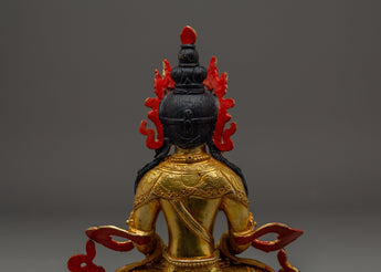 This Healing Deity Amitayus Artwork is known as the deity of longevity, representing eternal life, knowledge, and spiritual blessings. This statue measures 8.7" (Height) x 6.9" (Base) and weighs 1.34 kg. It is made from fine copper, gilded with 24K gold, acrylic paintings, and deeply engraved with handcarved gemstones . This artwork is created by expert Nepalese craftsmen representing the holy creativity of Himalayan Buddhism and would make an ideal addition to altars, meditation rooms, or sacred collections.