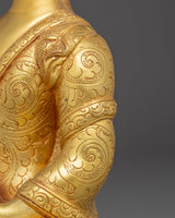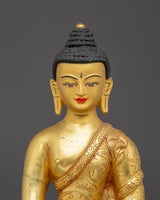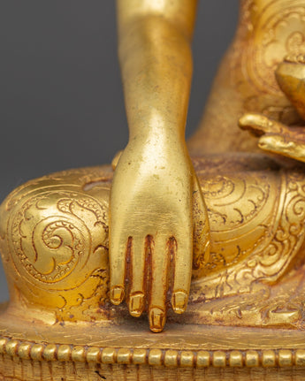 This Himalayan Copper Shakyamuni Buddha Sculpture stands 8.9” (22.5 cm) in height with a base width of 5.7” (14.5 cm) and weighs 1.19 kg. Crafted from a copper body and adorned with gold electroplating and delicate gold and acrylic paintings, it is expertly handcrafted by skilled Nepali artisans. Reflecting both spiritual reverence and traditional craftsmanship, this sculpture makes a meaningful addition to altars, meditation areas, or personal sacred spaces.