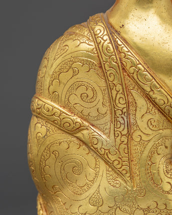 In its iconography, Shakyamuni Buddha is seated in padmāsana (lotus posture) upon a moon-disc lotus base, with the right hand in bhūmisparśa mudrā (earth-touching gesture) symbolizing his enlightenment. The left hand rests in his lap, holding an alms bowl, representing renunciation and simplicity, while the presence of the uṣṇīṣa (cranial protuberance) signifies his awakened wisdom.