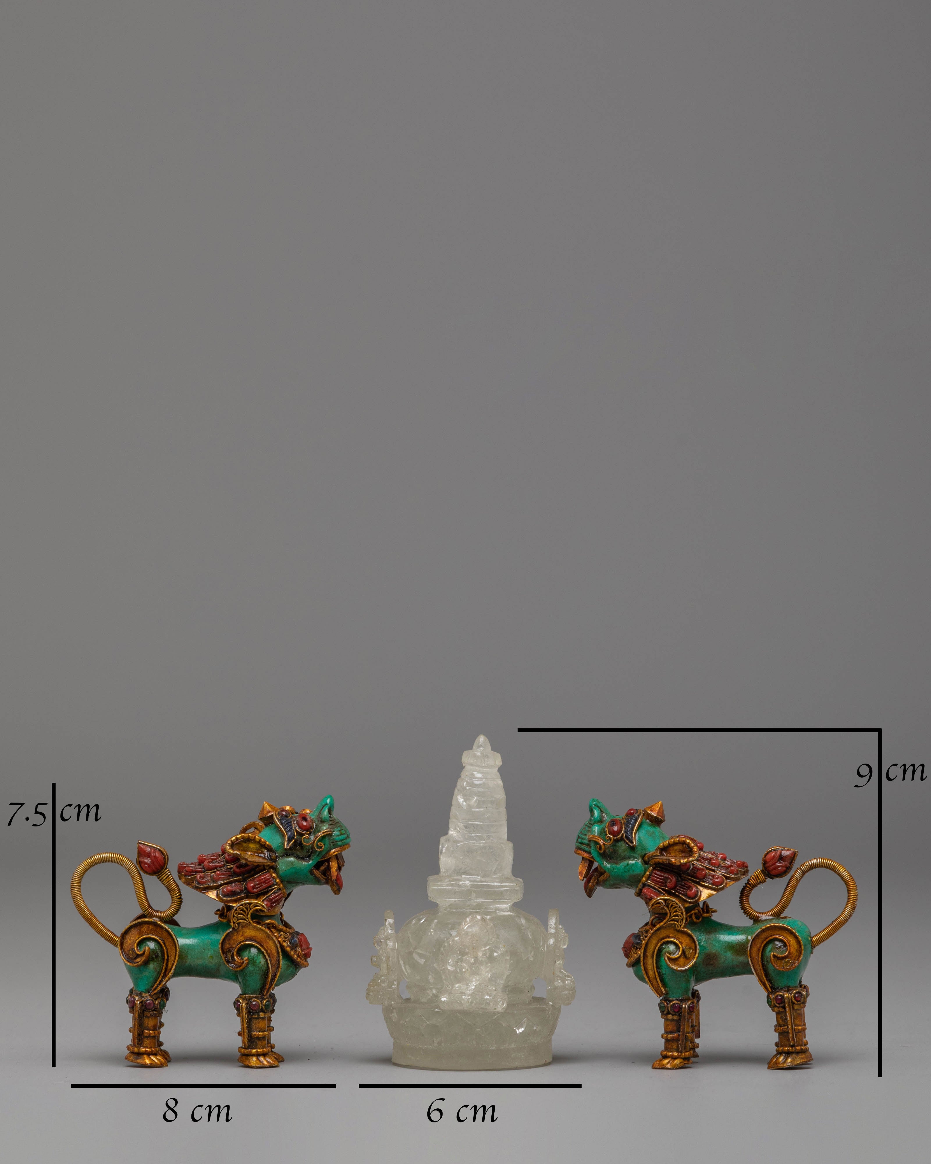 The Himalayan Crystal Stupa and Guardian Lion Set is a stunning combination of spiritual protection and enlightenment. The crystal stupa, standing 9 cm tall, is crafted from high-quality crystal and features intricate copper detailing. The stupa’s serene and elegant design symbolizes the path to enlightenment in Tibetan Buddhism. The addition of vibrant coral and turquoise artificial stones enhances its spiritual significance, representing protection, wisdom, and harmony.