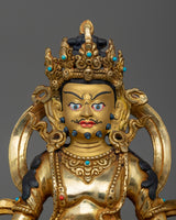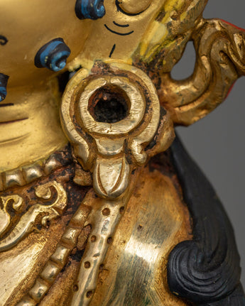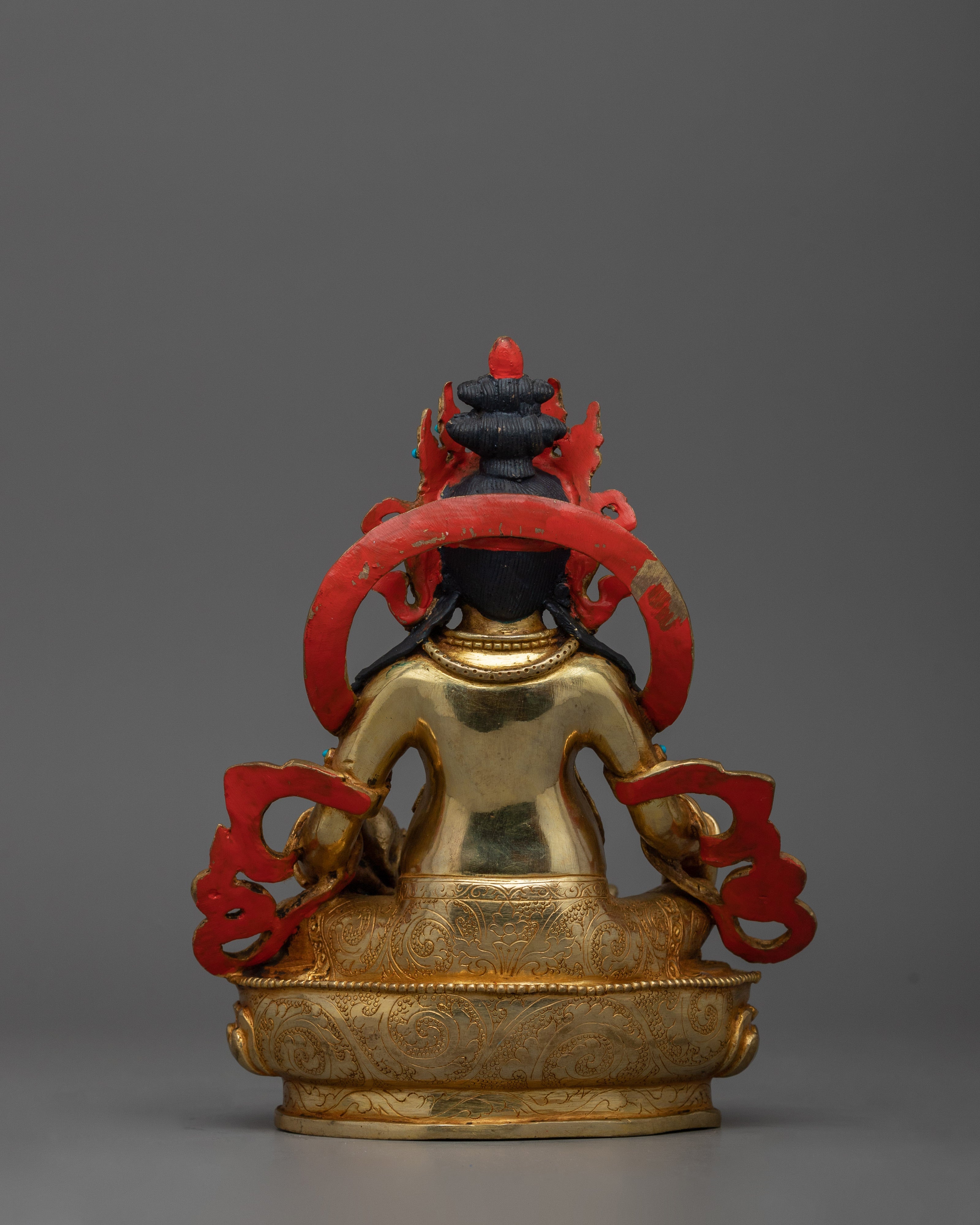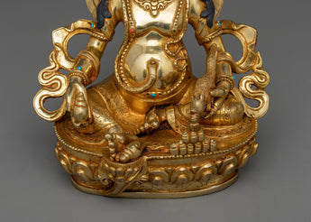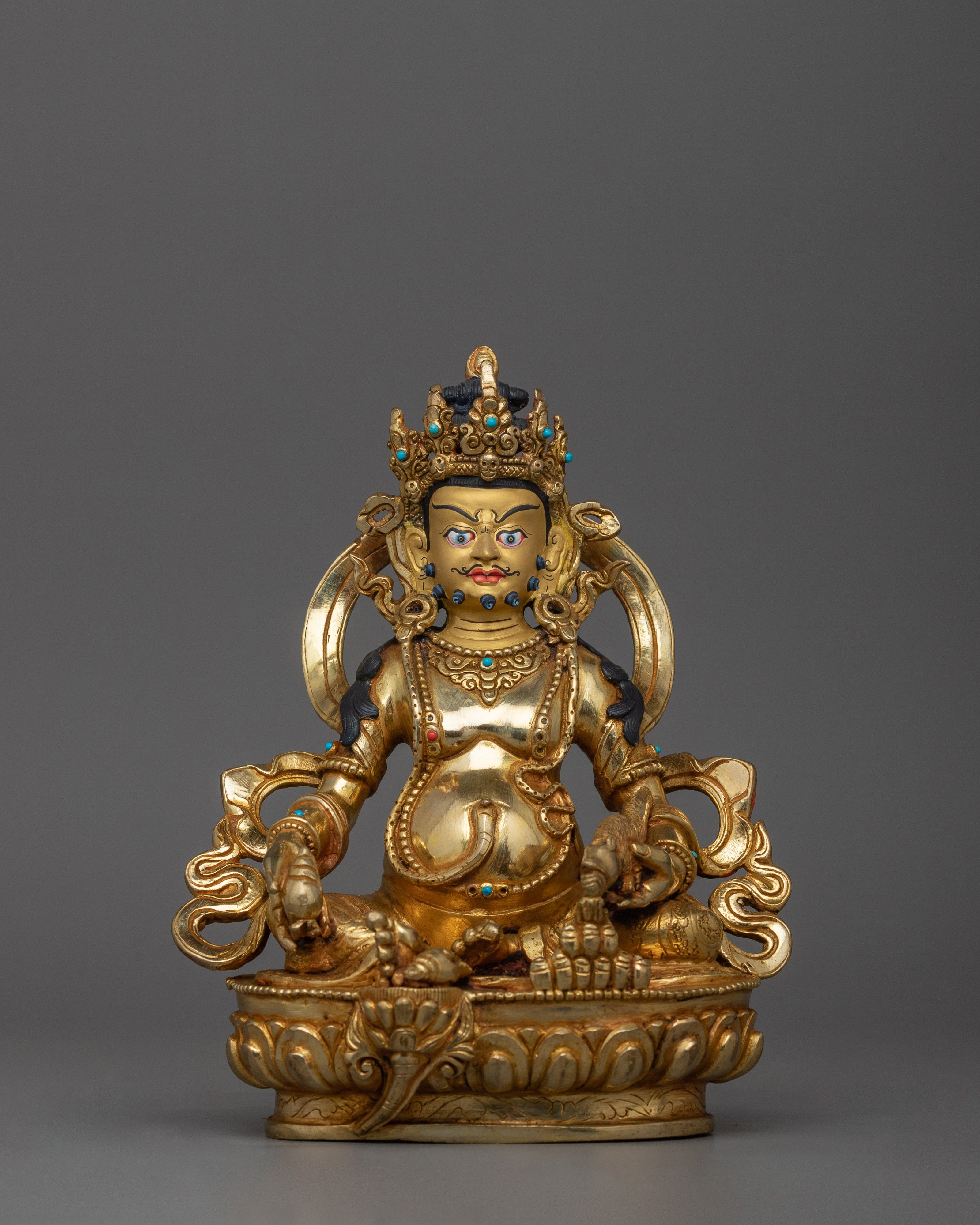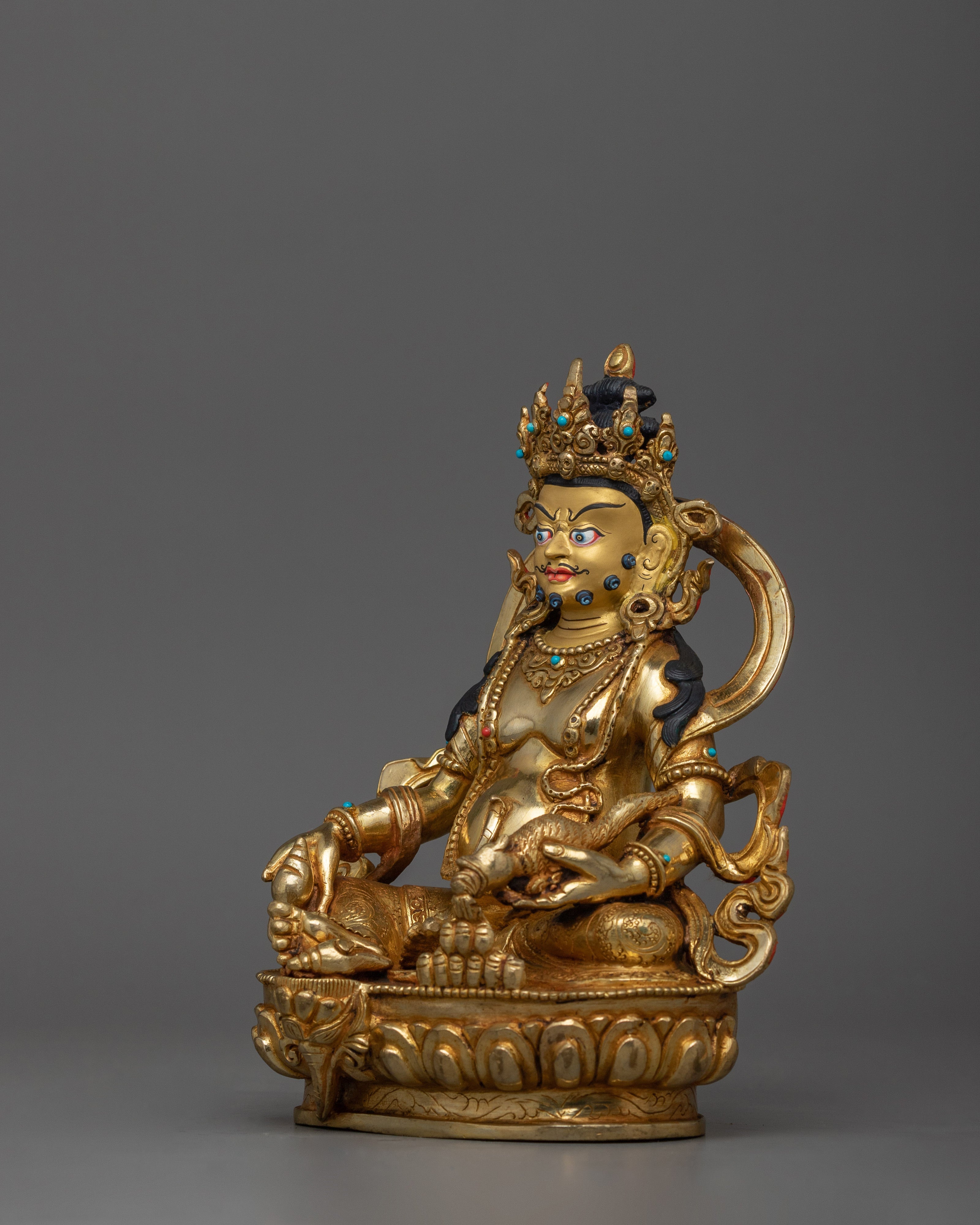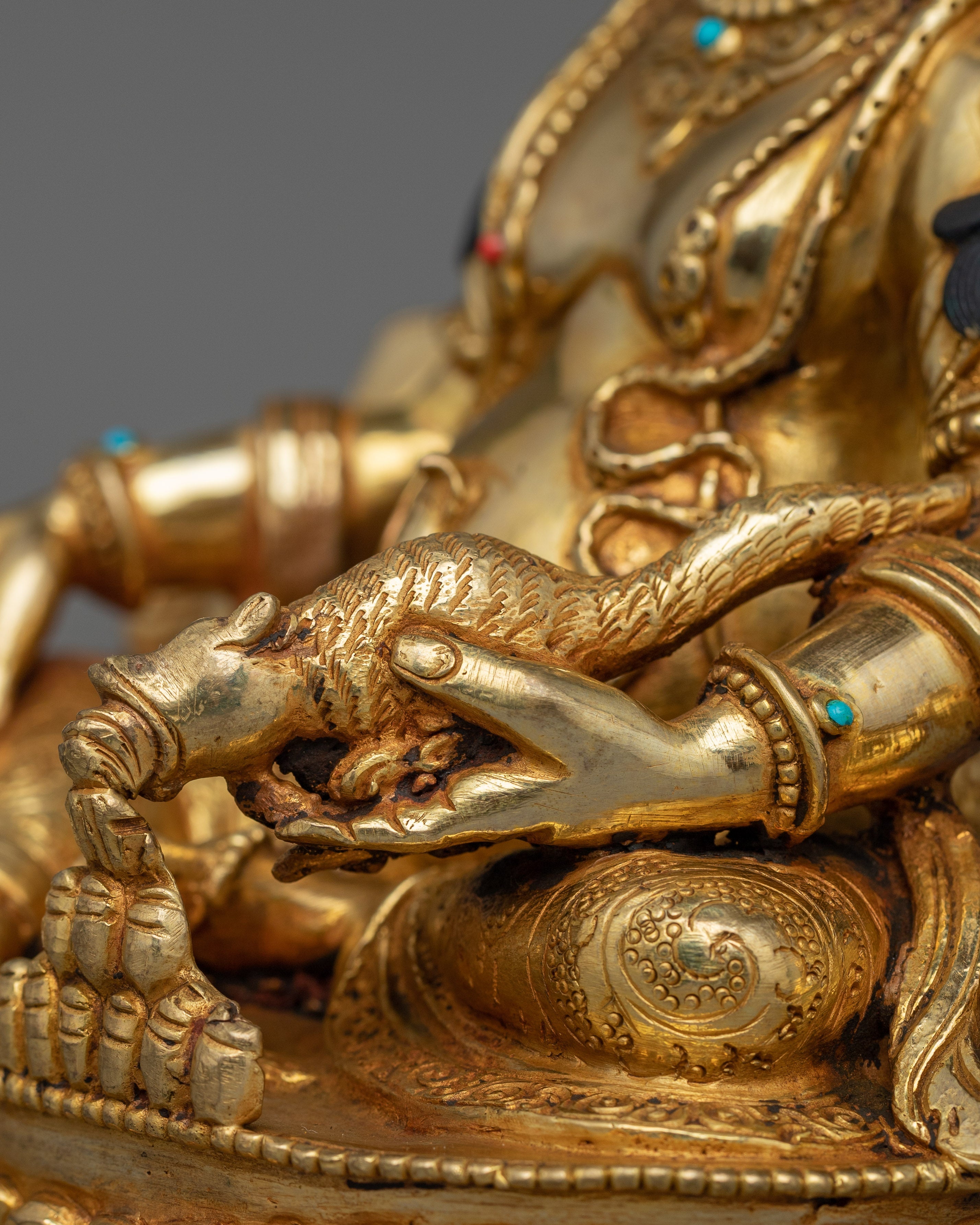 Dzambhala is depicted in a sitting position, holding a mongoose in his left hand to symbolize the removal of material and spiritual obstacles. In contrast, his right hand rests in the Granting Mudra with Citron Fruit. His crown, encrusted with magnificent gems, symbolizes the prosperity and plenty he bestows on his disciples. Dzambhala's strong yet sympathetic visage reminds practitioners of his protective nature and capacity to alleviate poverty by providing spiritual and practical gifts.