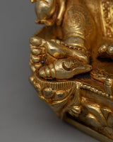 This is a handmade Himalayan statue of Dzambhala. Standing at 8.1”/20.5cm (Height) and 6.5”/16.5cm (Base). Made up of a copper body and 24k gold gilding. Designed by talented Nepalese artisans, this detailed sculpture is ideal for altars, meditation areas, or as a meaningful decorative item for individuals seeking to cultivate awareness in their daily life.