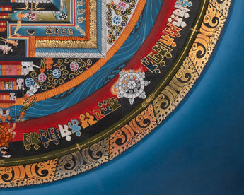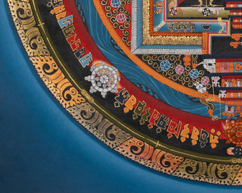 Learn about the eternal power of the Kalachakra Mandala Thangka, a sacred and highly significant piece of art that perfectly captures the concepts of space, time, and transformation. The mandala is hand-painted on high-quality cotton canvas with acrylic colors that are delicately blended to provide rich depth and vibrant hues. The use of genuine 24K gold throughout the artwork, especially in the delicate outline of the mandala's elaborate embellishments, further enhances the divine presence. The gold highlights enhance the mandala's sacred nature, which provides a brilliant contrast to the vivid hues of the interior structures. In addition to providing a clean and bright surface, the acrylic paints have been skillfully blended to enable smooth transitions and striking contrasts between the many layers and components.