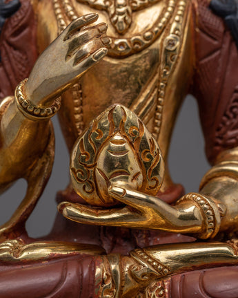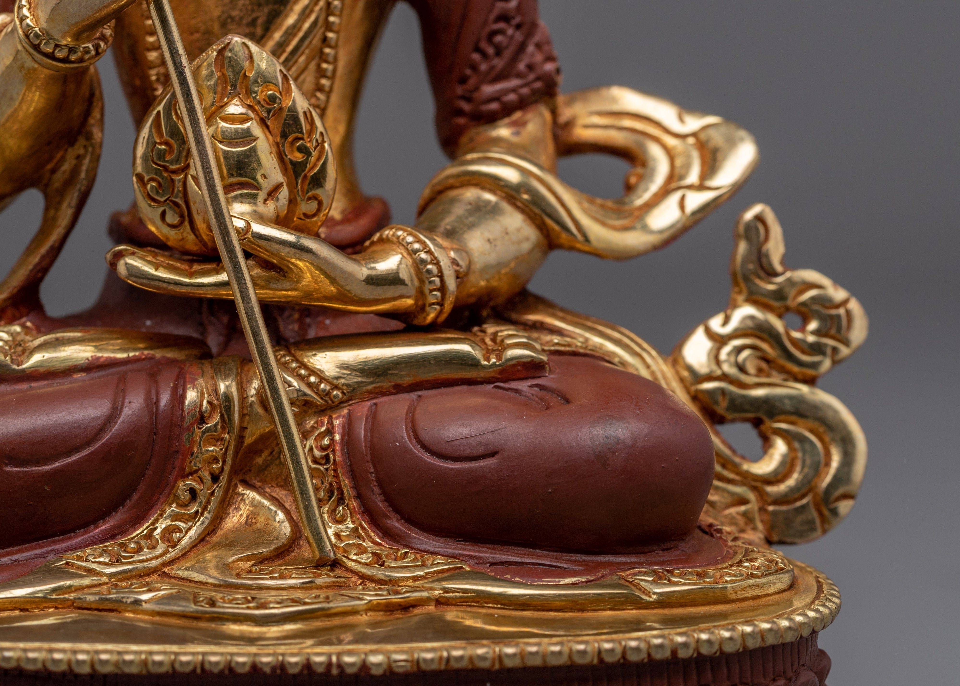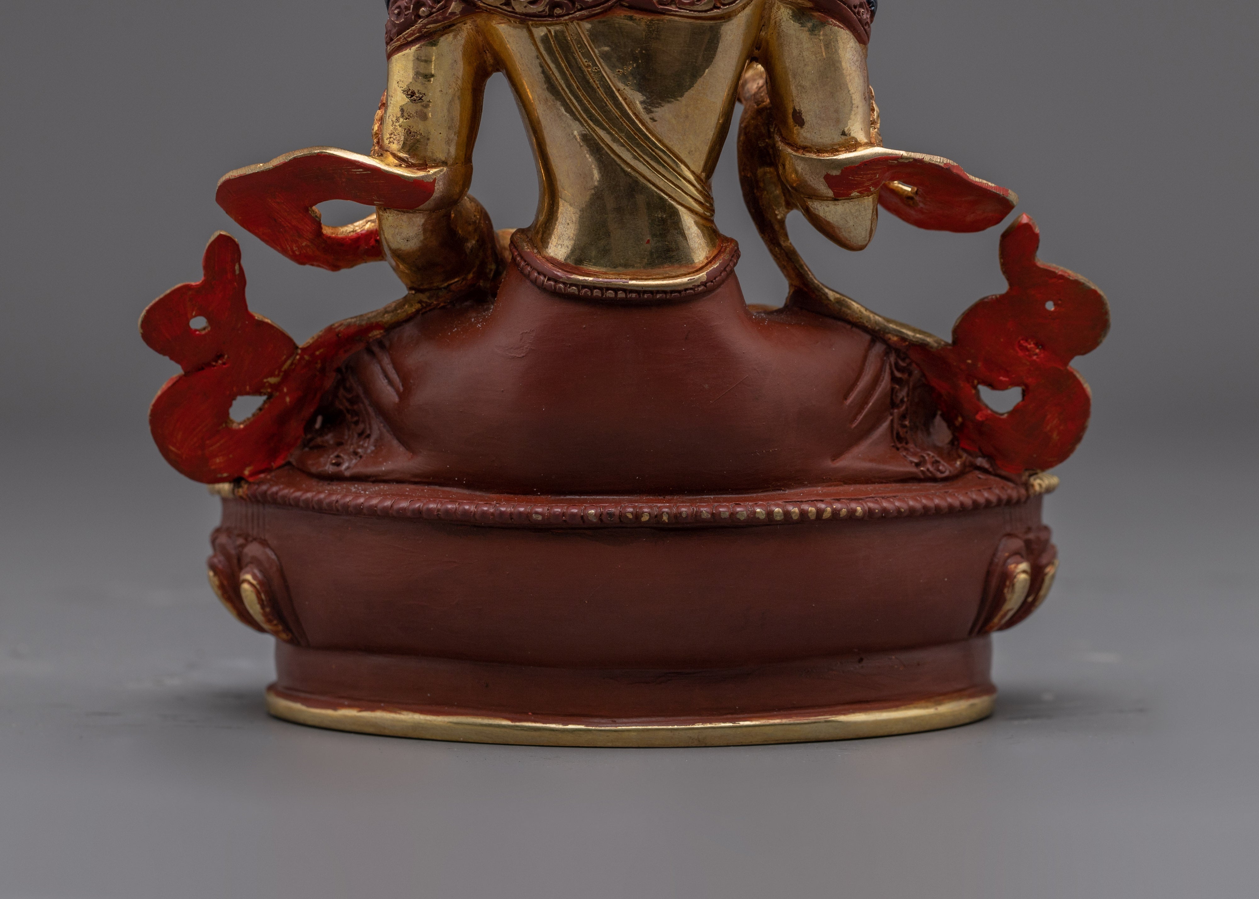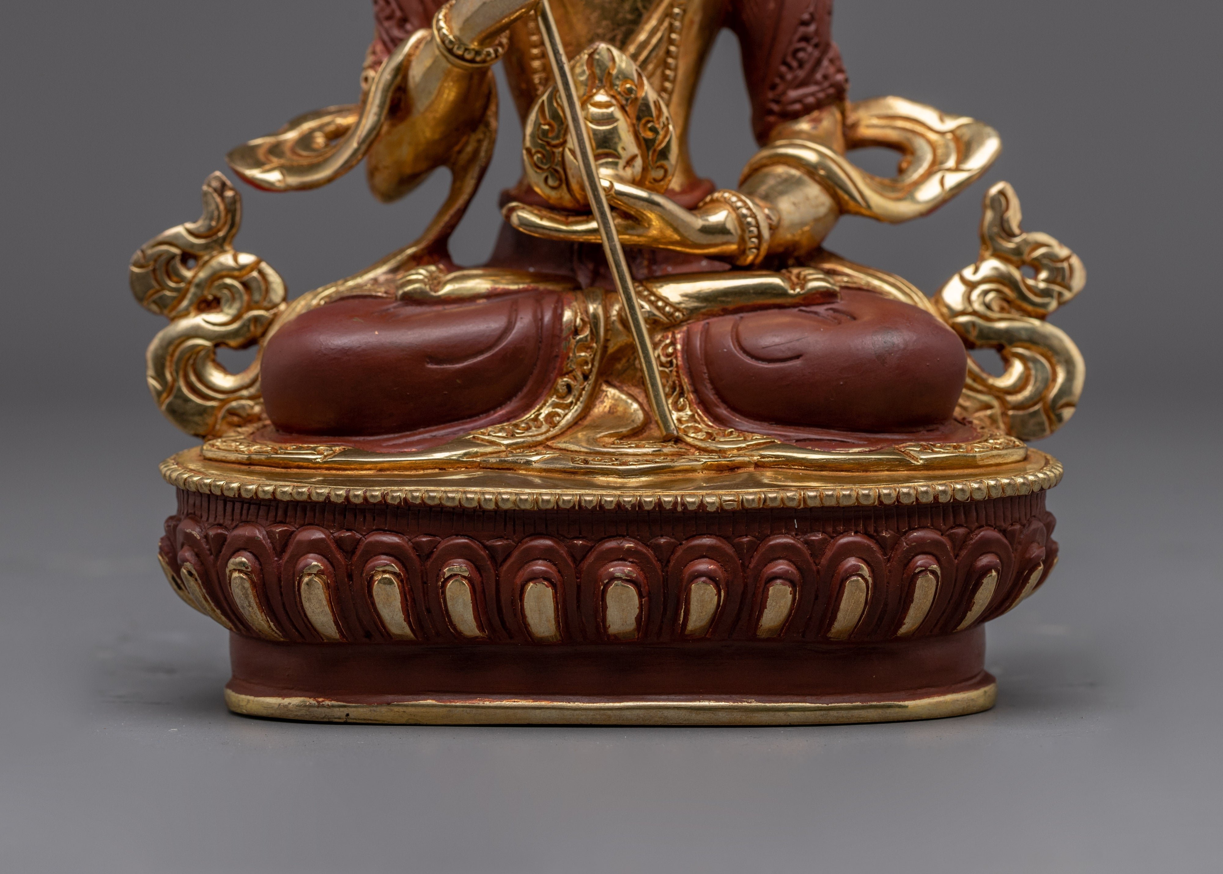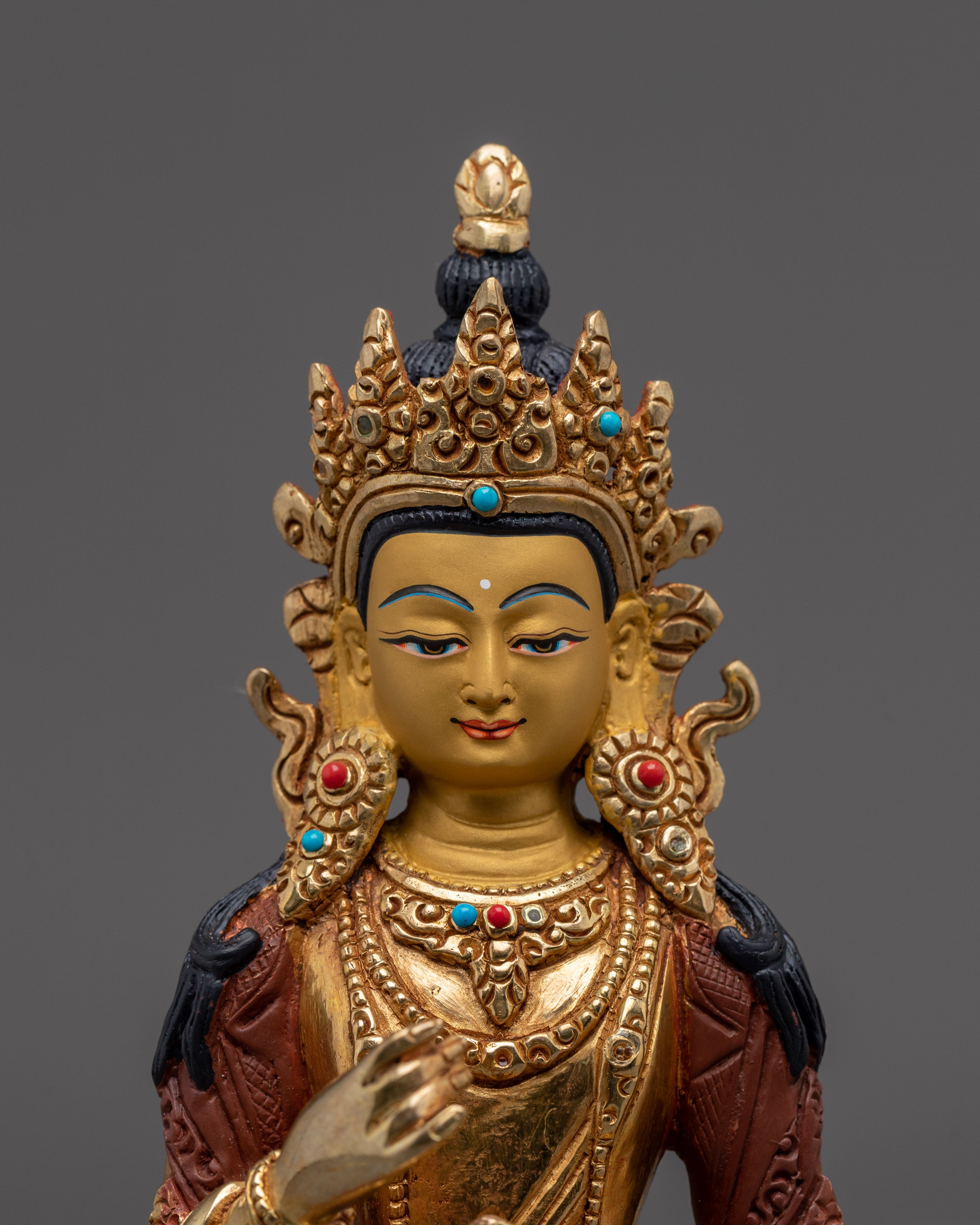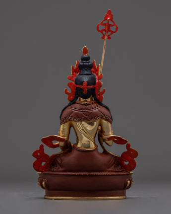 This Kshitigarbha Statue, one of the Eight Great Bodhisattvas, stands at 11.2”/28.5cm in height and 6.3”/16cm at the base, weighing 1.30 kg. Crafted from oxidized copper with 24K gold gilding, detailed gold and acrylic paintings, and adorned with gemstones, this statue exemplifies skilled Nepali craftsmanship. Perfect for altars and meditation spaces, it embodies the boundless wisdom and vast compassion of Kshitigarbha, guiding practitioners on the path to enlightenment.