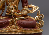 This Kshitigarbha statue is depicted seated in the padmāsana (lotus posture) on a lotus base, symbolizing purity and spiritual awakening. He wears a five-pointed crown representing the Five Dhyani Buddhas, signifying his enlightened qualities. In his right hand, he holds a staff (khakkhara), symbolizing spiritual authority and the guiding of beings on the path. His left hand holds wish-fulfilling jewels (cintāmaṇi), representing the fulfillment of all spiritual and worldly desires. This iconography reflects Kshitigarbha’s boundless wisdom and compassionate ability to grant blessings and support practitioners in their journey toward enlightenment.