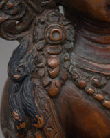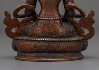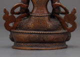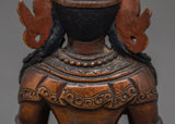 This Amitayus Longevity Deity Statue represents the blessings of longevity, health, and immortality in Tibetan Buddhism. This handcrafted statue is 5.7" (Height) x 3.9" (Base) and weighs 0.53 kg. It is made of oxidized copper and has a divine spiritual appeal. Amitayus, commonly referred to as the Buddha of Infinite Life, is said to bestow longevity and spiritual well-being to his devotees. This sculpture brings the divine blessings of health and longevity into your meditation place or shrine, encouraging peacefulness and courage in the face of life's hardships.