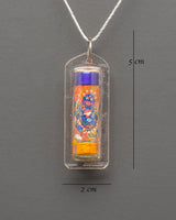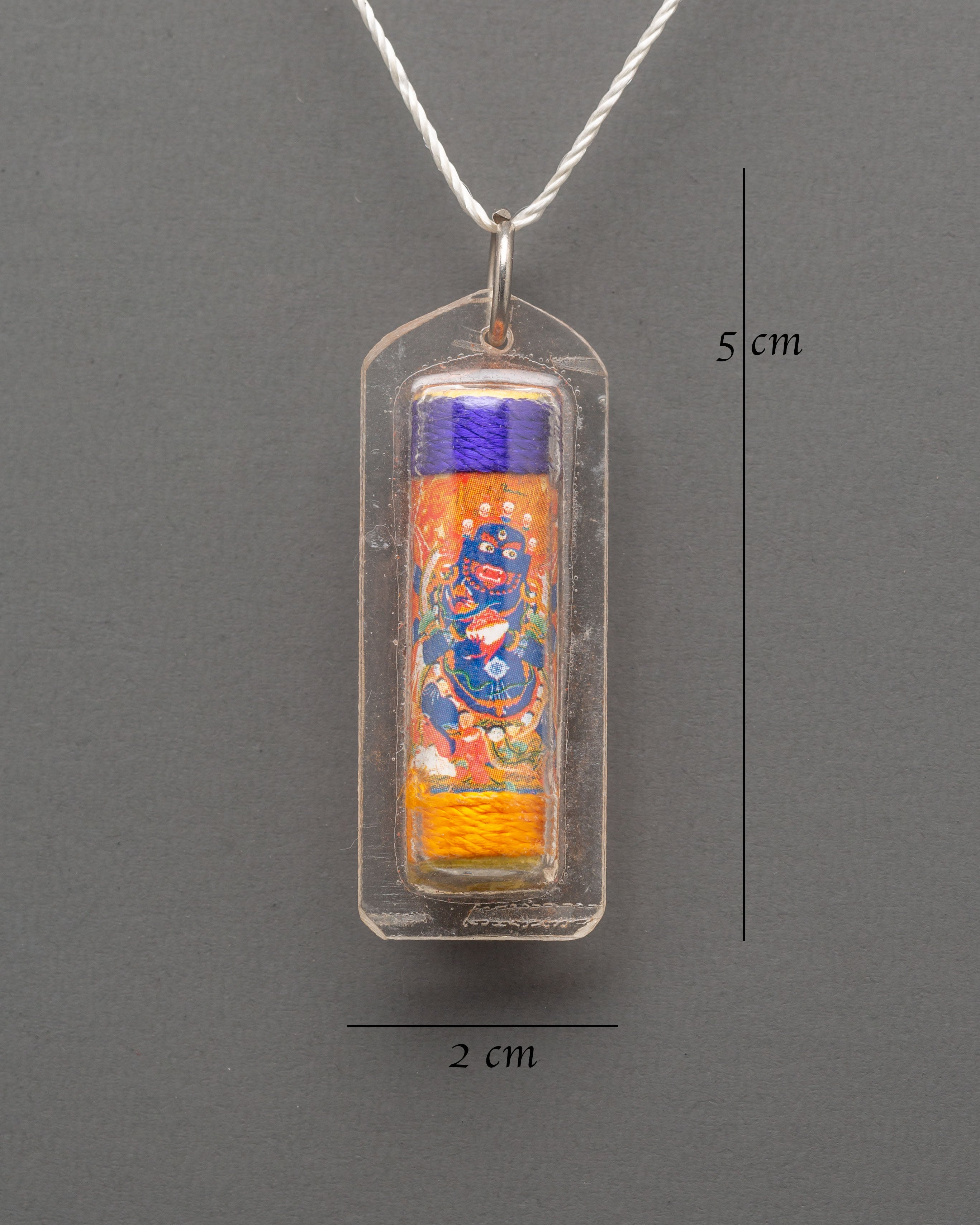 This Mahakala Buti is a sacred Tibetan amulet meant to summon the strong and compassionate energy of Mahakala, the deity of wisdom and protection. This little protective necklace, measuring 5cm in height and 2cm in breadth and weighing 0.004kg, features a vibrant canvas depiction of Mahakala housed in a plastic cover bound with symbolic, colorful threadwork. The primary artwork depicts Mahakala in his wrathful aspect, encircled by flames of purifying, indicating his ability to expel negativity and destroy impediments on the spiritual path.