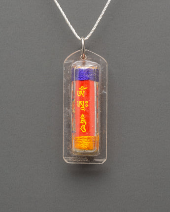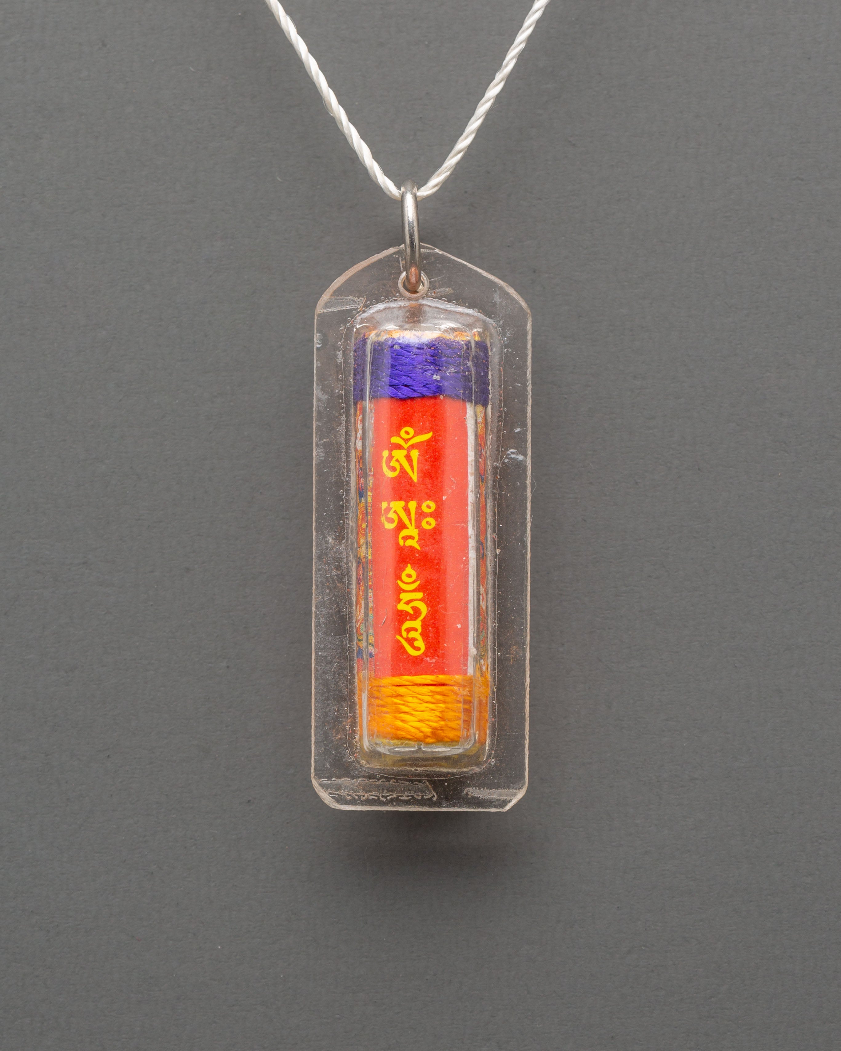Every Tibetan Buddhist amulet, including this Buti, is customarily blessed and worn for protection, good fortune, and spiritual equilibrium. The vivid threads, which are often yellow, blue, and orange, represent the five elements (earth, water, fire, air, and space), and they harmonize the wearer's energies. Its compact, lightweight shape makes it suitable for wearing as a necklace, carrying in a pocket, or placing on an altar as a protection charm during meditation or travel.