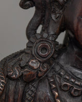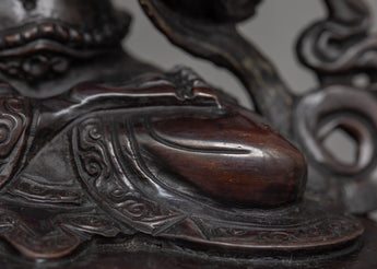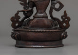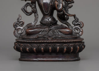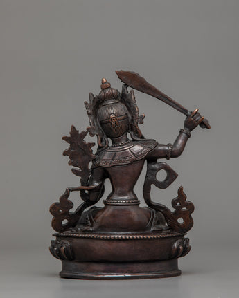 The Manjushri Buddhist Deity of Wisdom Figurine, measures 6.7 inches (17cm) in height and 5.1 inches (13cm) at the base. The Bodhisattva of Wisdom is crafted from a oxidized copper body. Crafted by expert artisans, this item symbolizes the rich traditions of Himalayan Buddhism, making it an important addition to altars, meditation places, or holy collections.