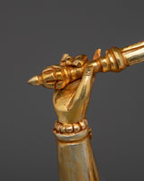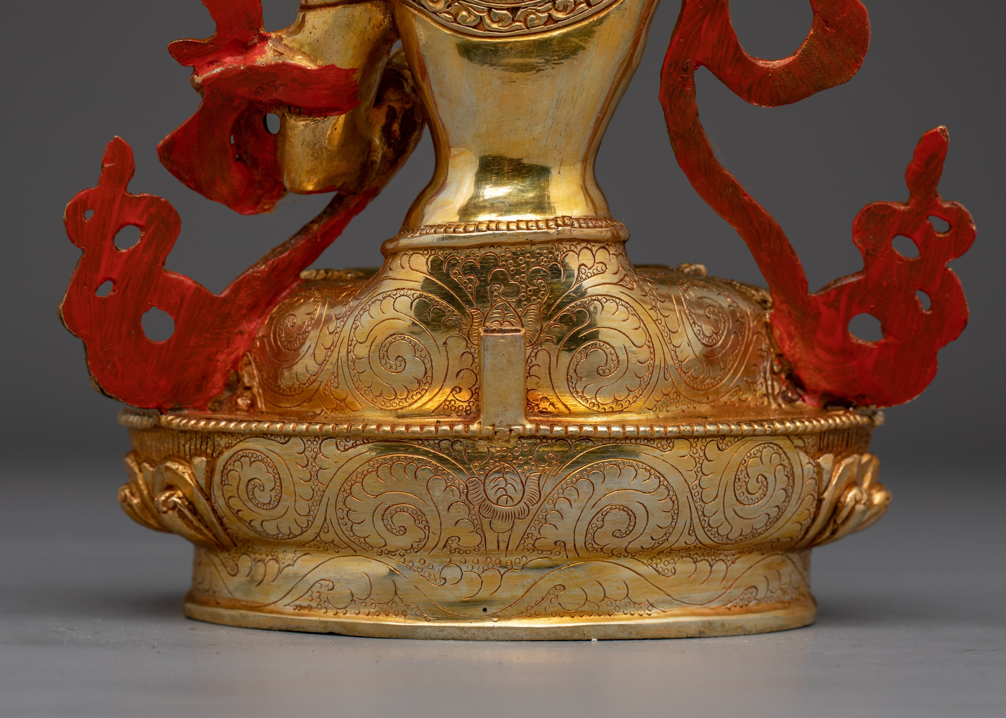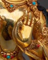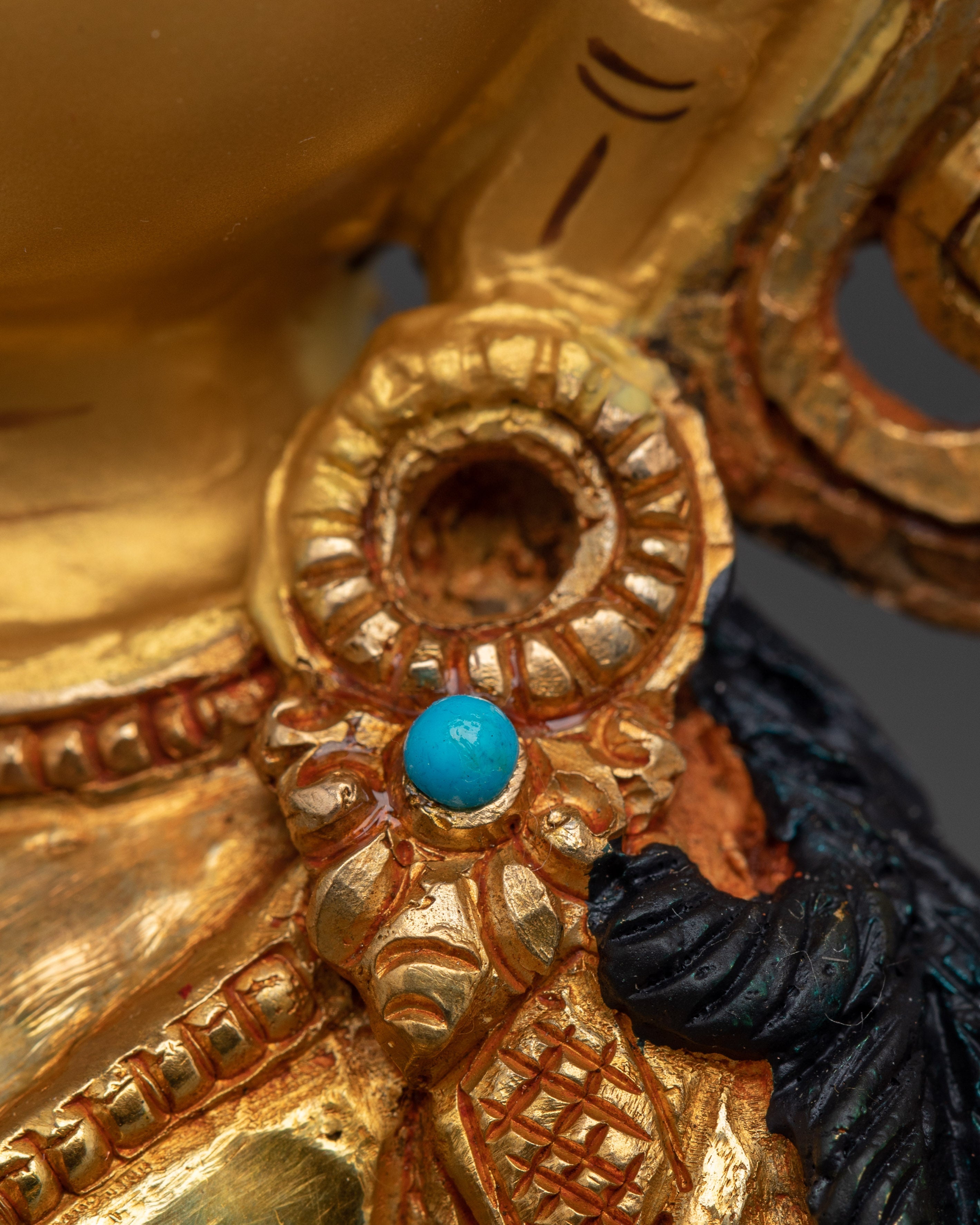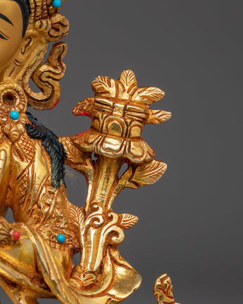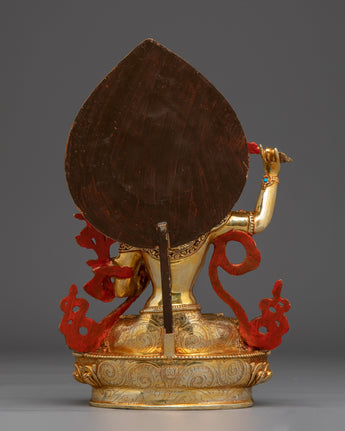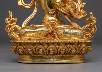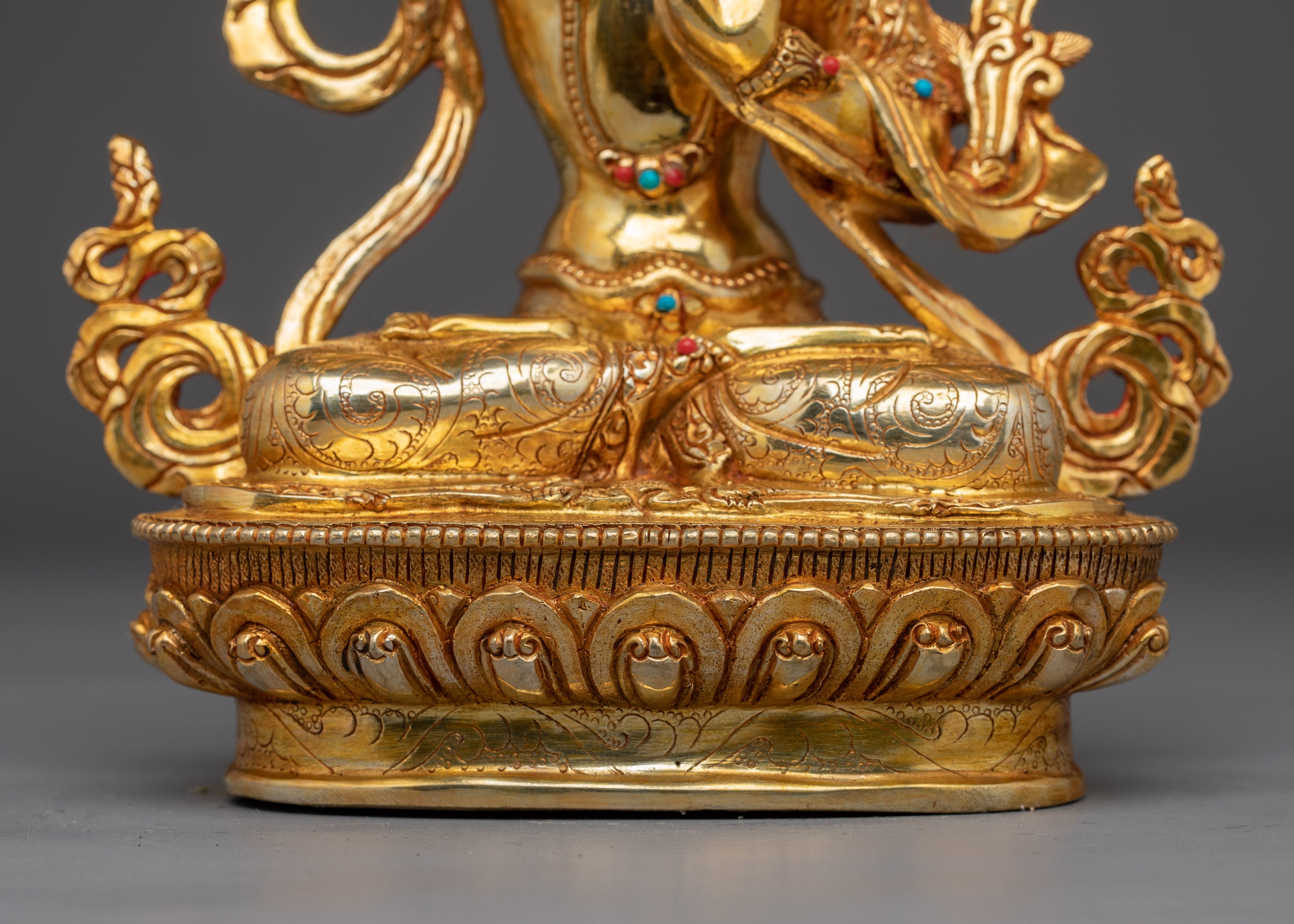 This handmade Manjushri Deity for Wisdom and Meditation is a stunning work of Tibetan art, towering 10.2 inches tall and elegantly gilded in 24K gold. The statue depicts the Bodhisattva of Wisdom, holding a sword in his right hand to symbolize the cutting of ignorance, and a text in his left hand to represent the Buddha's teachings. This statue, embellished with bright jewels, exudes a powerful energy of knowledge, clarity, and spiritual understanding.