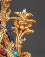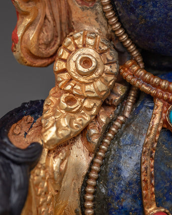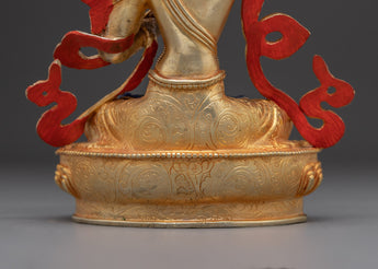 Manjushri, Spiritual Wisdom Icon stands 8.5 inches (21.5 cm) tall with a base measuring 6.5 inches (16.5 cm), and weighs 1.40 kilograms, offering a balanced and refined presence. Made from a solid copper body, it is richly adorned with 24K gold gilding that radiates a luminous, sacred glow. Intricate gold and acrylic paintings bring out the fine details and traditional motifs, while carefully inlaid gemstones add vibrant color and symbolic depth.