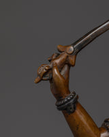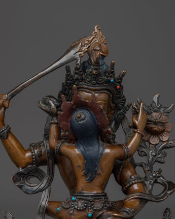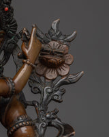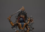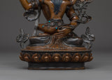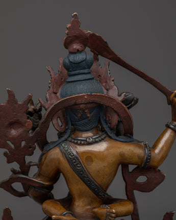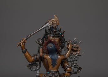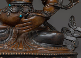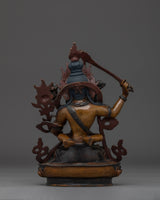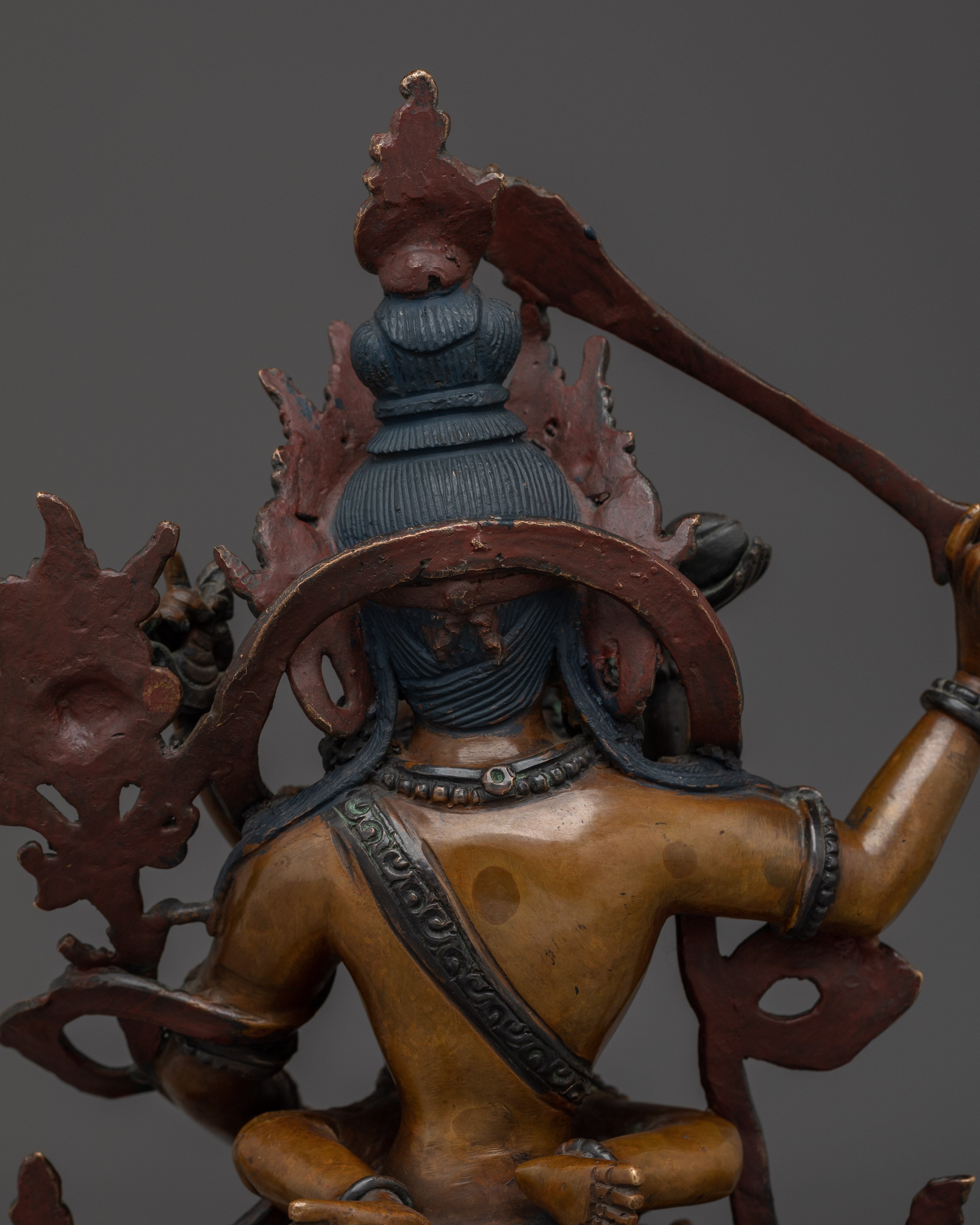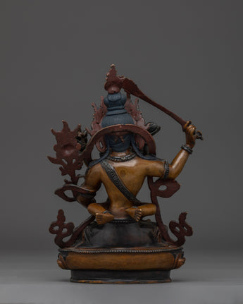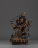 Manjushri with consort stands 9.1” (23 cm) tall with a 6.9” (17.5 cm) base and weighs 1.98 kg. Handcrafted from an oxidized copper body and adorned with acrylic paintings, this piece reflects the deep symbolic union of wisdom and compassion. A powerful addition to tantric altars, meditation spaces, or sacred art collections, this statue radiates meditative clarity and enlightened energy.