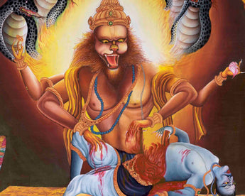 Narasimha, also known as the man-lion, is a Hindu god who is an incarnation of Vishnu, the supreme deity of Vaishnavism and a member of Hinduism's Trimurti. The name is derived from the Sanskrit words Nara, which means "man," and Simha, which means "lion" or "strong one." He is represented as having a human body, a lion's head, and occasionally claws. Narasimha is one of the Dashavatara's ten primary avatars of Vishnu.
