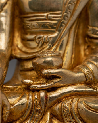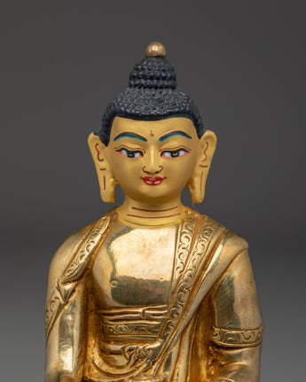 The Nepali Art of Shakyamuni Buddha is crafted from copper and beautifully adorned with 24K gold gilding and intricate gold and acrylic paintings. Measuring 5.9”/15cm in height and 3.7”/9.5cm at the base, it weighs 0.61 kg. Representing the historical Buddha, Siddhartha Gautama, this statue symbolizes enlightenment, inner peace, and the path to liberation. Compact yet spiritually powerful, it is ideal for personal altars, meditation spaces, or as a meaningful gift of the spirit.