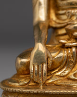 Shakyamuni Buddha is depicted sitting in the lotus pose (padmasana), indicating his steady concentration and mastery over the distractions of the material world. His right hand stretched toward the earth in the bhumisparsha mudra, representing his moment of enlightenment, as he invited the earth to witness his awakening. The left hand, lying gently in his lap in dhyana mudra holding an alms bowl, depicts the profound state of meditation and mindfulness that leads to insight and clarity.