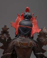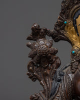 The Oxidized Female Enlightenment Deity White Tara, a symbol of compassion, healing, and longevity, radiates divine grace and spiritual blessings. This wonderfully handcrafted statue, measuring 9.3" (Height) x 7.3" (Base) and weighing 2.10 kg, is made of oxidized copper, gold, and acrylic paints. This figure, crafted by talented Nepalese artisans, symbolizes the spiritual traditions of Himalayan Buddhism, making it a valuable addition to altars, meditation spaces, or sacred collections.