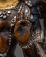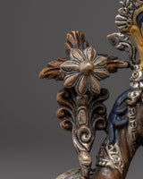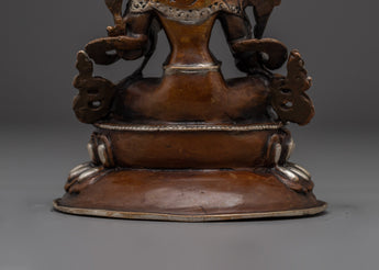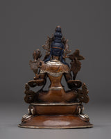 This Oxidized Green Tara Nepali Artwork represents protection, healing, and spiritual enlightenment. This handcrafted statue, measuring 5.3" (Height) x 4.1" (Base) and weighing 0.59 kg, is made of oxidized copper and boasts a durable and spiritual appeal. Crafted by expert artisans, this item embodies the rich traditions of Himalayan Buddhism, making it a valuable addition to altars, meditation spaces, or sacred collections.