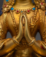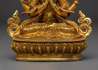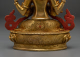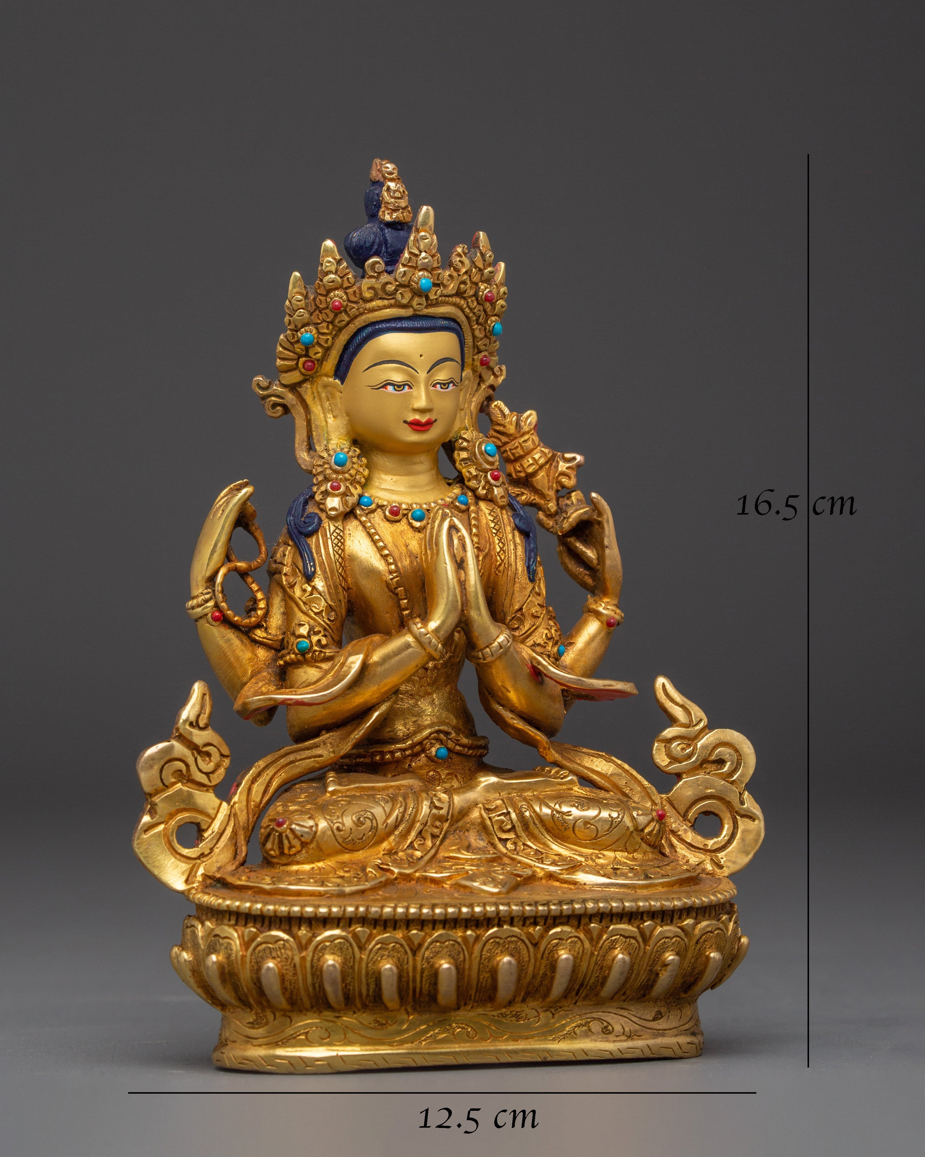 Peaceful Expression of Chenrezig Statue stands 6.5 inches (16.5 cm) tall with a base measuring 4.9 inches (12.5 cm), and weighs 0.85 kilograms. Made from a copper body, it is delicately gilded with 24K gold and features fine gold and acrylic artwork. Ideal for personal altars, meditation spaces, or sacred décor, this statue radiates peaceful energy and the compassionate presence of Chenrezig.