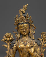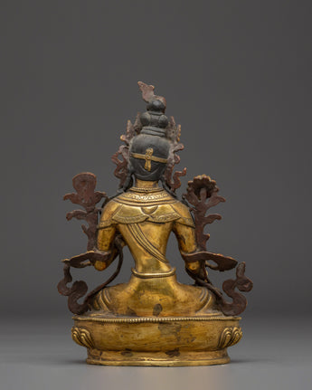 The Peaceful Golden White Tara Statue in Copper, a symbol of compassion, healing, and longevity, radiates divine grace and spiritual blessings. This wonderfully handcrafted statue, which measures 8.9" (Height) x 6.1" (Base) and weighs 1.65 kg, is made of copper, 24K gold gilding, gold, and acrylic paints. This figure, crafted by talented Nepalese artisans, symbolizes the spiritual traditions of Himalayan Buddhism, making it an important addition to altars, meditation places, or sacred collections.