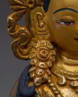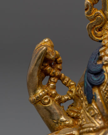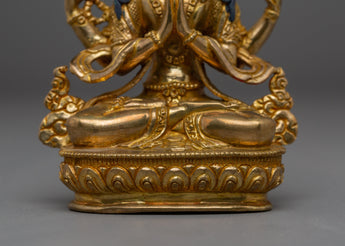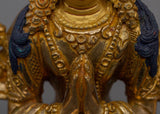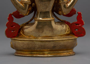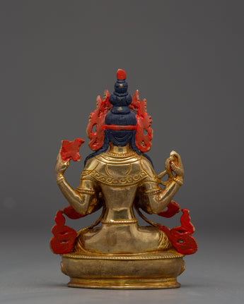 Protector of Tibet Chenrezig Statue measuring 5.5” (14 cm) in height with a 3.9” (10 cm) base and weighing 0.54 kg. This statue is made from a copper body, gilded in 24K gold, and adorned with gold and acrylic paintings. Ideal for personal altars, travel, or meditation spaces.