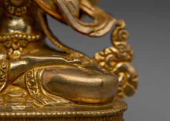 The deity sits on a moon-disc lotus seat. A crystal rosary in the upper right hand symbolizes the never-ending cycle of life, death, and regeneration. The lotus in the upper left-hand represents the deity's role in assisting mankind to overcome adversity and unpleasant conditions, including hellish realms. The lower hands are gently put in a namaste motion, grasping a wish-fulfilling Jewel. The deity's gentle and calm expression symbolizes compassion and calmness.