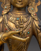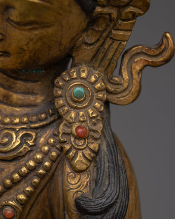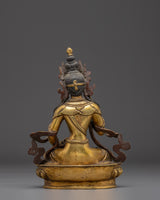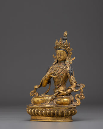 This Purification Symbol Vajrasattva Art, known as a symbol of purity and wisdom, represents spiritual purification and the removal of obstacles on the path to enlightenment. This handcrafted statue, measuring 8.7" (Height) x 6.1" (Base) and weighing 1.46 kg, is made of copper Body and adorned with gemstones and 24K gold gilding, as well as acrylic paint work. Crafted by expert Nepalese artisans, this sacred item embodies the rich traditions of Himalayan Buddhism, making it an important addition to altars, meditation areas, or sacred collections.
