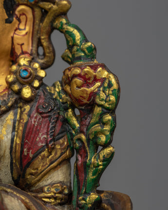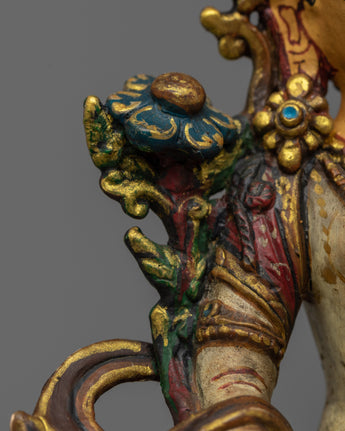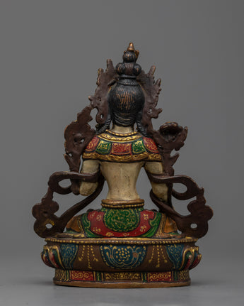 Discover the timeless beauty of this Colored White Tara Statue, which stands gracefully at 6.3 inches. A statue of great perfection, it has delicate paintings in gold and acrylic, 24K gold gilding, and a copper body that radiates compassion and peace. As a calm reminder of White Tara's healing properties and soothing presence, it is perfect for people who are just starting out on their spiritual path or who want to improve their meditation practice.