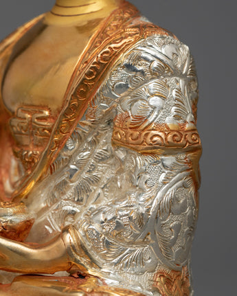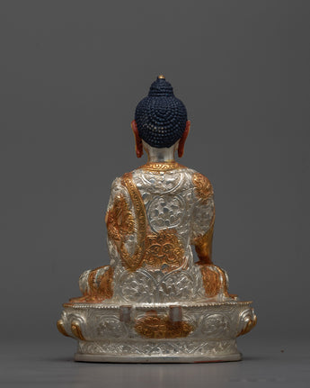 Savor the stunning quality of our Ratna Sambhava Silver Plated Statue, an amazing piece of lovingly crafted by talented artisans. This statue stands 10.2 inches tall and has a 7.5-inch base. It is made of copper and features 24K gold gilding, silver plating, and detailed acrylics. Ratnasambhava, known for his embodiment of charity and equality, is represented with exceptional precision and creativity, highlighting his calm and powerful presence.