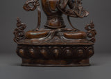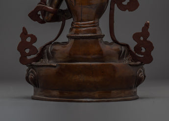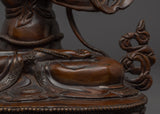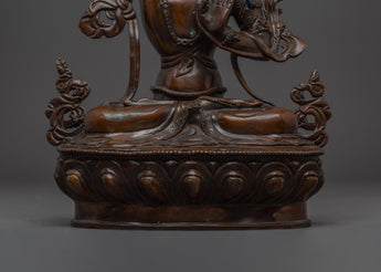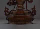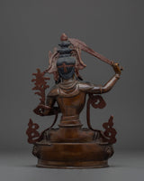 The Religious Statue of Manjushri stands 13.8” (35 cm) tall with a 9.8” (25 cm) base and weighs 3.51 kg. Made from an oxidized copper body, it is decorated with gold and acrylic paintings that highlight its exquisite details. This statue symbolizes the cutting away of ignorance and the illumination of enlightened knowledge, making it a perfect addition to any meditation space or sacred collection.