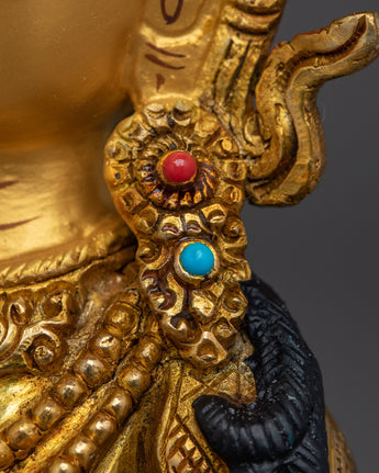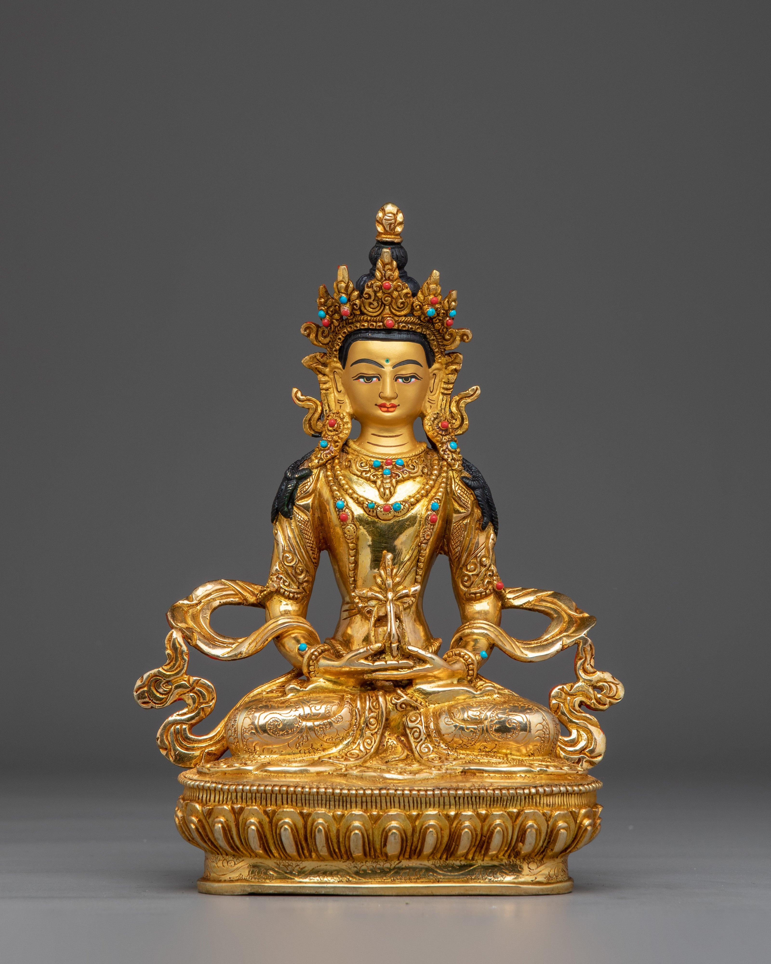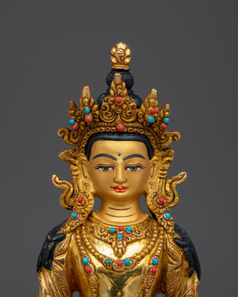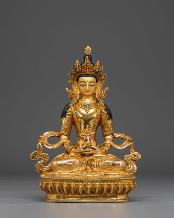 Sacred Amitayus Statue stands 25.5 cm (10 inches) tall with a 17 cm (6.7 inches) wide base and weighs 1.47 kg. Made from a copper body, it is adorned with 24K gold gilding, detailed gold and acrylic paintings, and hand-set gemstones, reflecting traditional Himalayan artistry. Perfect for spiritual practice or as a unique art collectible, this statue offers both aesthetic beauty and deep symbolic meaning, making it a captivating addition to any sacred or contemplative space.